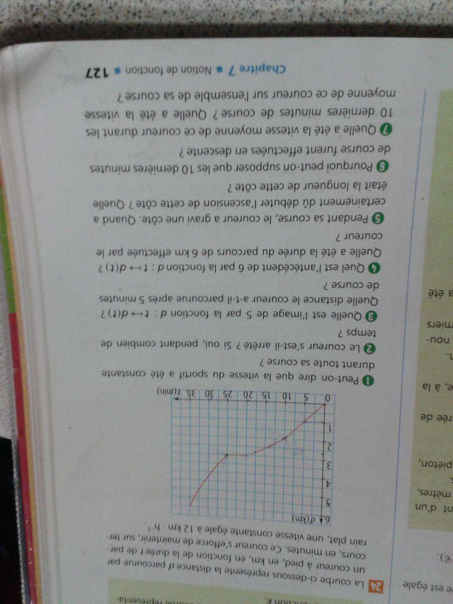 1. Non on ne peut pas dire que la vitesse du coureur a été constante. 2. Oui le courreur s"est arrêté pendant 5 minutes. 3. l"image de 5 est 1, après 5 min de course, le courreur a parcourru 1km