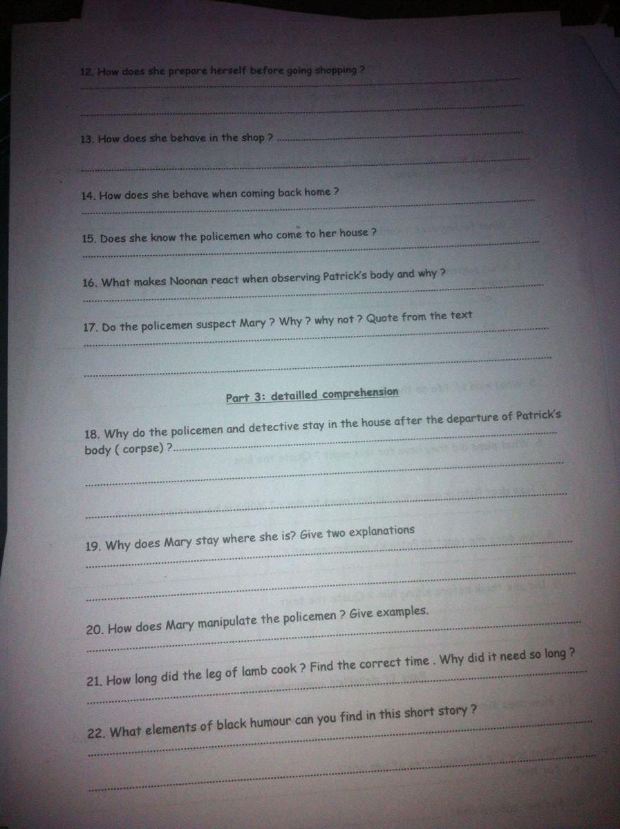Bonjour, est ce que quelqu'un pourrait m'aider pour les questions? Le texte est celui ci http://www.classicshorts.com/stories/lamb.html je l'ai déjà traduit sauf que je n'arrive pas a repondre aux questions. De l'aide svppp