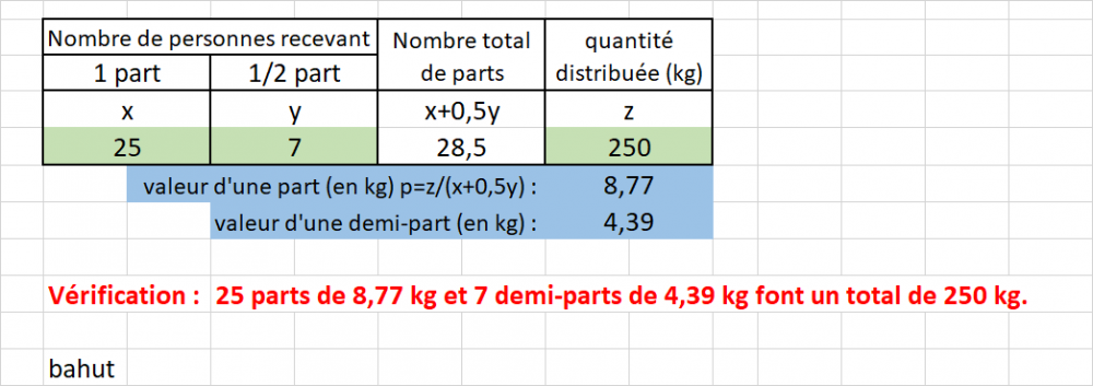 Bonjour, Pour compléter la réponse de Jules, je te propose de t'intéresser à la feuille de calcul ci-jointe (tableur). Cette feuille est protégée par un mot de passe (bahut) donc tu ne peux saisir des valeurs que dans les trois cellules vertes qui ne sont pas verrouillées. Tu peux tester cette feuille avec le deuxième exemple de ton énoncé. Les noms que j'ai attribués aux données (en fait il n'y en a que TROIS x, y et z) ne sont pas ceux utilisés par Jules mais la démarche est la même.... Valeur d'une part : z/(x+0,5y) EB210929 parts.xlsx Copie d'écran