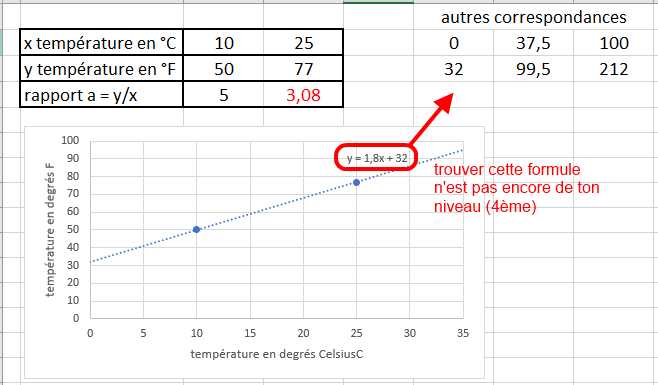 Que tu ne comprennes pas "les proportionnalités" est une chose (mais on te parle de cela depuis l'école primaire : 3 sucettes coûtent 1,5 € ; combien coûtent 7 sucettes ?) soit ! Cependant en 4ème, ton prof a dû te faire un cours sur cette notion.... Je te donne un petit tableau qui je l'espère te rappellera quelque chose ? x température en °C 10 25 y température en °F 50 77 -