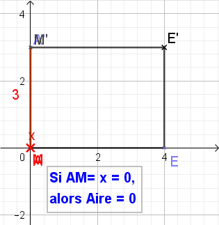 Bonsoir, Il vaudrait mieux ne mettre qu'UN SEUL exercice par message.... Je vais essayer de t'aider à commencer le premier de ces 3 exercices On considère tout d'abord que x qui est la distance AM est compris entre 0 et 4 unités. On peut essayer de voir (et comprendre !) ce qu'il se passe pour quelques valeurs particulières de x (et on généralisera ... ensuite) Dans le cas particulier ci dessous, tu ne devrais pas avoir de difficulté à calculer l'aire du rectangle coloré en marron. Dis nous comment tu fais.