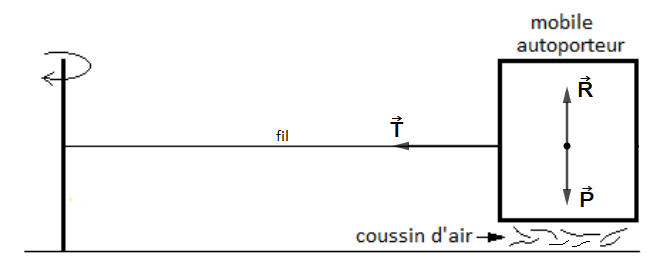 * La force " du lancer " a probablement existé au moment où un opérateur a lancé le mobile autoporteur. Ensuite l'opérateur s'est éloigné et la force " du lancer " n'existe plus : Oublions là. * La force "attractive" est une force fantôme qui n'a aucune réalité autre que celle de ton imagination. Oublions là aussi ! * La résistance de l'air qui a tendance à s'opposer au mouvement circulaire (frottements contre l'air) a été supposée négligeable : Négligeons là Toute force doit pouvoir être décrite comme étant exercée par "quelque chose" ou "quelqu'un" sur le système étudié. Ainsi, le poids du mobile qui est la seule force que tu as trouvée pour l'instant peut être décrite comme étant une force exercée (à distance) par la Terre sur le mobile autoporteur. Donc : Force 1 : Le poids Force 2 : .................... exercée par ............... sur le mobile autoporteur. Force 3 : .................... exercée par ............... sur le mobile autoporteur. Je renouvelle ma question : Quelles sont les deux forces manquantes qui s'exercent sur le mobile autoporteur ?