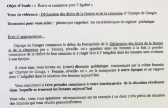 2. Bonsoir j'ai un devoir maison de français pour jeudi est-ce que quelqu'un pourrait m'aider svp ?? Je dois faire un discours Polémique en rapport avec notre époque et en rapport avec l'inégalité dans la situation des femmes aujourd'hui. Est-ce que quelqu'un aurait une ou des idées à me proposer ? Merci d'avance