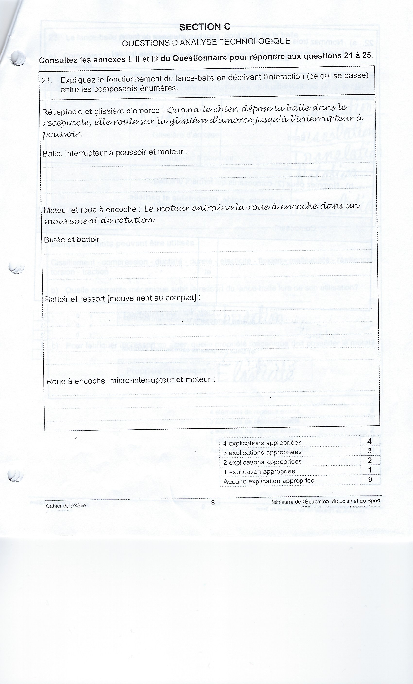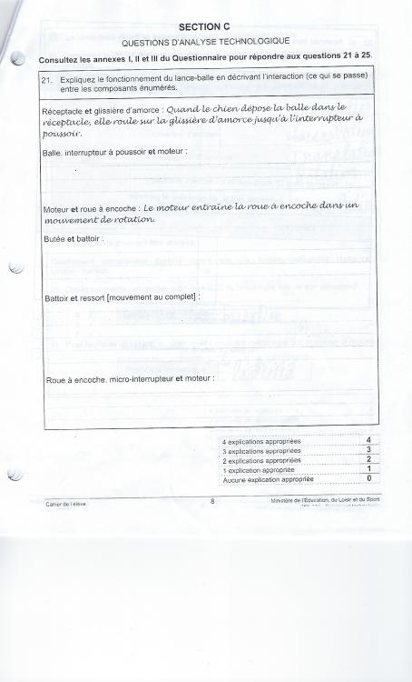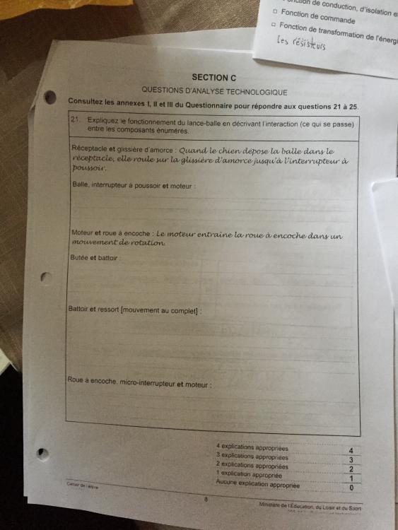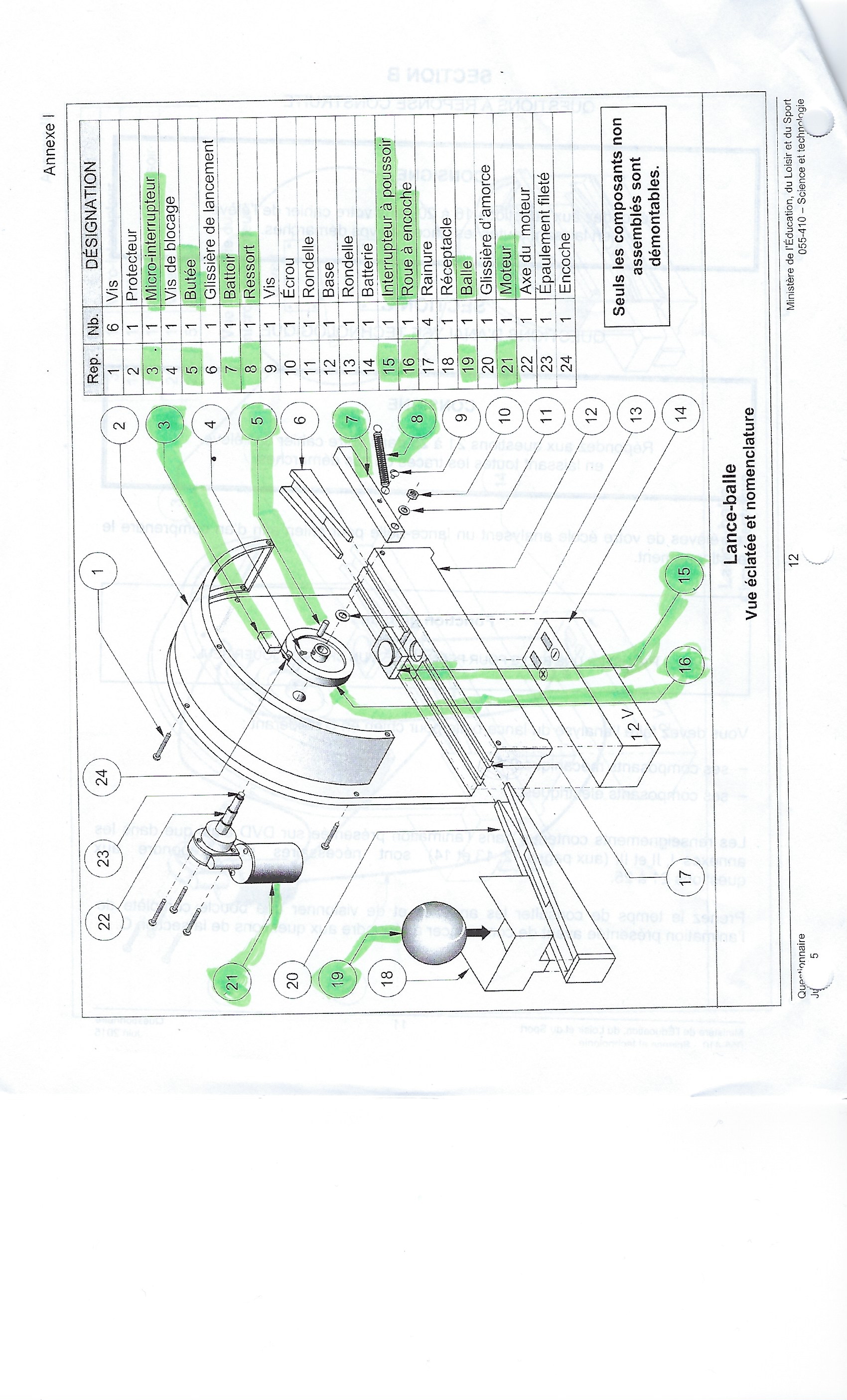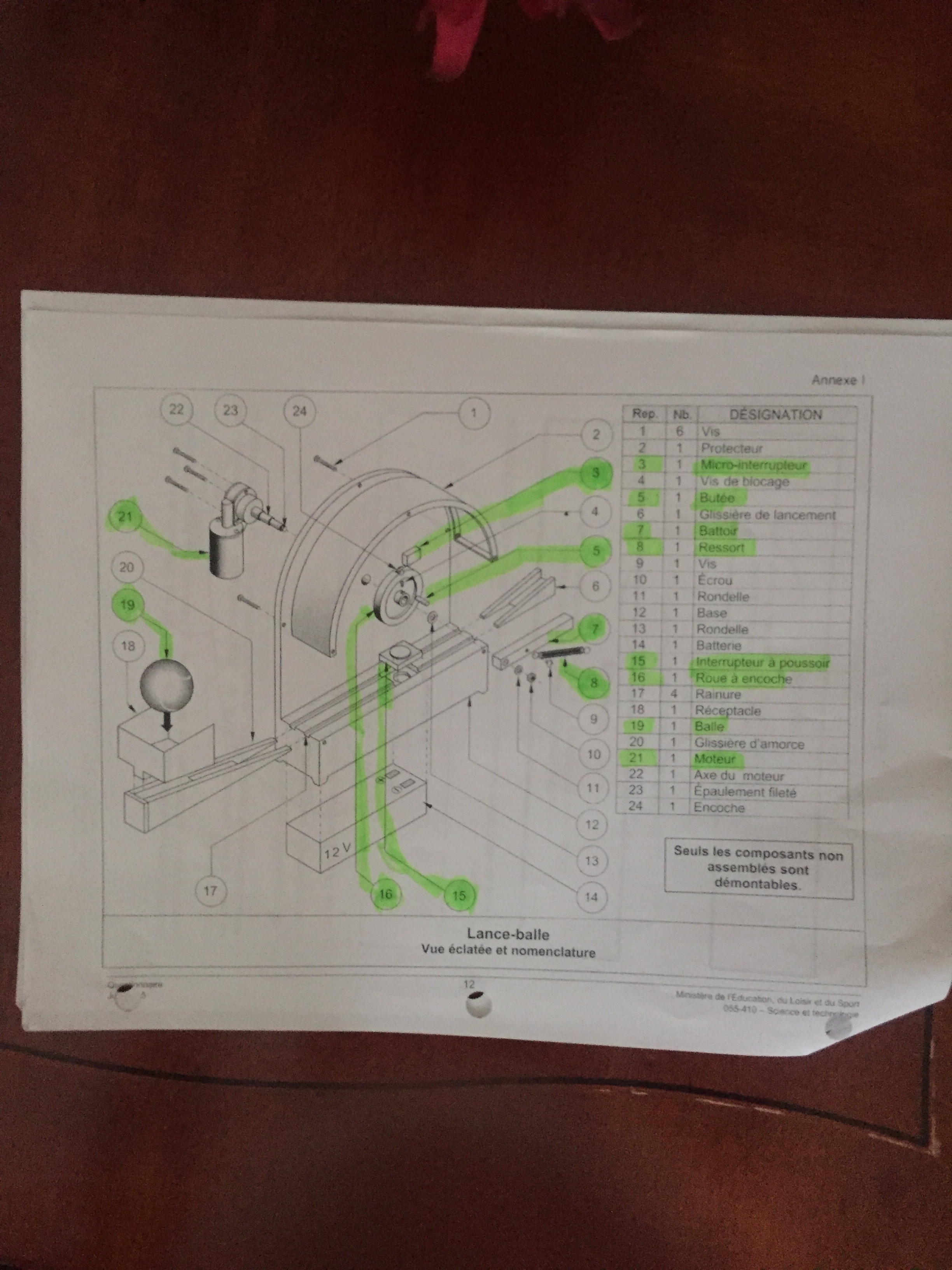 15. Bonsoir!Alors voici le numéro et ce que j'ai fais j'aimerais que vous me corrigiez merci de votre aide 1.Balle,interrupteur à poussoir et moteur: Lorsque le chien cours vers la balle balle et frappe l'interrupteur à poussoir avec son corps et moteur il y a qui sont lié a la base de manière directe et démontable.Pour ce qui forment la liaision je dirais indirecte et démontable puisque ca peut se démonter. 2. Butée et battoir:La butée tourne pour permettre le trajet de la balle vers le battoir pour moins compliquer le fonctionnement habituel. 3.Battoir et ressort (mouvement au complet):Lorsque la balle frappe le battoir elle est projétée directement vers le ressort pour ensuite aller vers la roue à encohe. 4.Roue à encoche, micro-interrupteur et moteur: Lorsque la balle est rendue a la roue à encohe montre sur le genre de cercle pour ensuite aller au micro-interrupteur et finalement et pour finalement retourner à la case du départ le point d'arriver (le moteur). Voici la photo du problème plus le schéma.Ps j'ai souligner les objets utiliser pour ces questions que sa sois plus facile pour que vus les voyez et m'aimder.