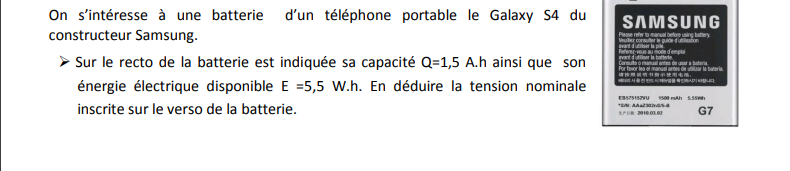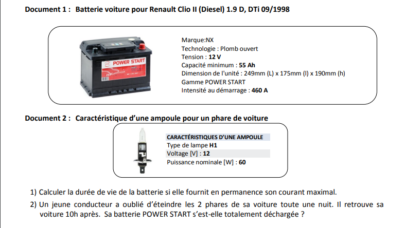 Bonjour et merci Black Jack. Je corrige. Pouvez-vous s'il vous plaît me corriger la suite ? Merci 3) Puissance dissipée par effet joule de la résistance r. Pj = r x I ? Pj = 0,01 x 360 ? je ne sais pas. 4) Puissance utilisée par le démarreur. Pu = U x I = 9,2 x 350 = 3220 W 5) le rendement r électrochimique de la batterie. r = Pu / Pa r = 3220 / Pu + Pj ? Merci