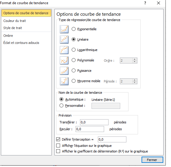 C'est disponible aussi sur Excel On trace le graphique en nuage de points. On sélectionne le graphique et on met le curseur sur un point du graphique On fait un clic droit On sélectionne : ajouter une courbe de tendance. On choisit "linéaire" Et (facultatif) on peut choisir un point où la courbe doit passer en cochant "définir l'intersection" ... où on peut imposer les coordonnées du point -