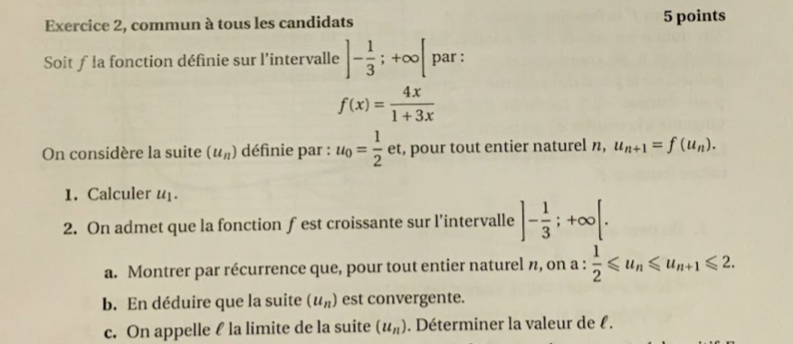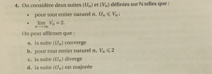 Bonsoir à tous, selon moi la bonne réponse est : d. la suite (Un) est majorée, mais comment le justifier ? Les deux suites peuvent être par exemple décroissantes et (Un) admettre 1 pour limite. Donc comment démontrer qu'il existe une valeur toujours supérieure à Un ? Un Vn suffit-il à affirmer que (Un) est majorée ? 🤔 Autre interrogation : Comment déterminer la valeur de la limite l de (Un) à la question 2)c. ? Peut-on affirmer qu'il s'agit de la même limite que celle de la fonction f ?