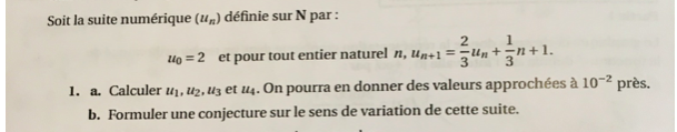 La suite de l'exercice permet d'obtenir une expression du terme général Un après être passé par une suite annexe. Ma question est donc de savoir si au stade de la question 2.c on attend simplement une réponse obtenue à l'aide de la calculatrice ou si une autre méthode peut être employée.