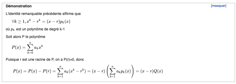 Question peut-être triviale mais je me demandais comment on démontre que la propriété de factorisation d'un polynôme à partir de ses racines est vraie pour tout x dans R 🤔 Je sais démontrer pour tout entier k naturel non nul et je tire la démo plus générale à partir de là, mais d'où vient que cette égalité est vraie pour tout x réel ? Merci d'avance pour vos éclaircissements -