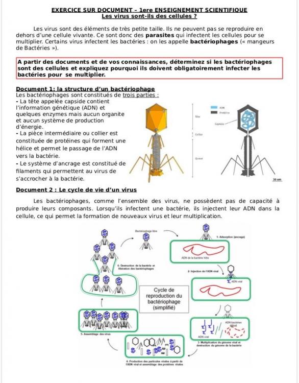 Bonjour , devoir SVT Mon devoir a été fait merci de me dire si cela est juste 👍 Les virus sont-ils des cellules ? 1) A partir des documents et de vos connaissances, déterminez si les bactériophages sont des cellules. 2) Expliquez pourquoi ils doivent obligatoirement infecter les bactéries pour se multiplier. 1)1- Un bactériophage est un virus n'infecte que les bactéries. Un bactériophage n'est pas une cellule. En efet, une cellule est capable de se multiplier sans l'aide de personne. Or, un bactériophage doit obligatoirement infecter une bactérie pour se multiplier. De plus, une cellule est capable de se maintenir en vie et de se développer. Le bactériophage ne possède pas ses capacités. Conclusion : un bactériophage n'est pas une celllule. une cellule. 2) Ainsi, le bactériophage n'infectera pas et n'éliminera pas toutes les bactéries, mais seulement celles qui seront reconnues par le phage et lui permettront de se multiplier. Les bactériophages, également appelés phages, sont un groupe de virus qui peuvent infecter et se multiplier dans les cellules bactériennes et favoriser leur destruction. L'information génétique d'un ADN ou d'ARN est présente sous forme de bactériophage.A insi, un bactériophage injecté soit de l'ADN, soit de l'ARN dans la bactérie. Bien cordialement, Juju