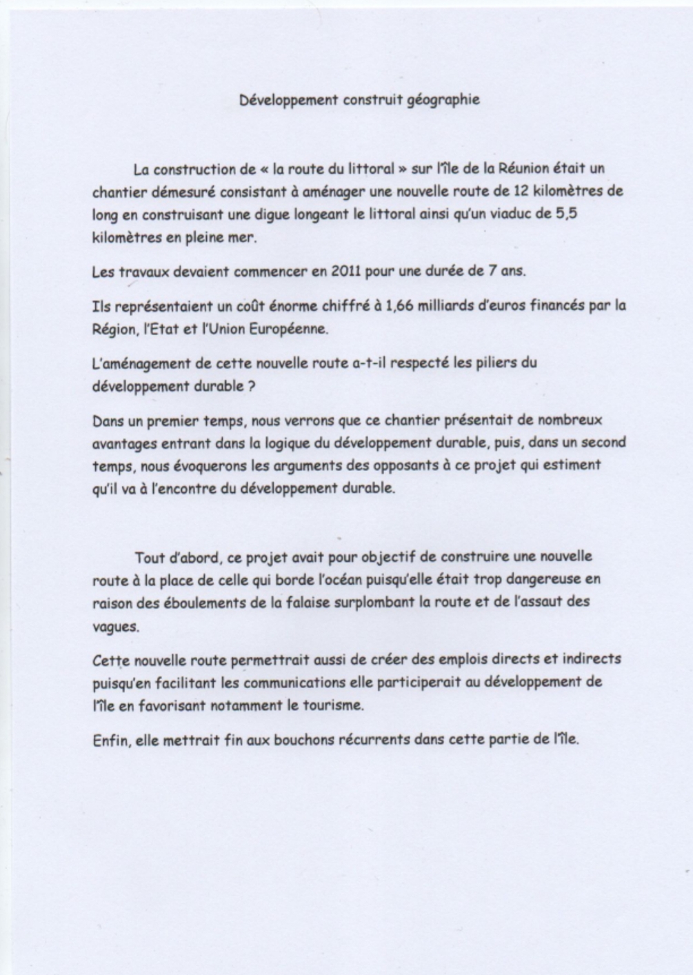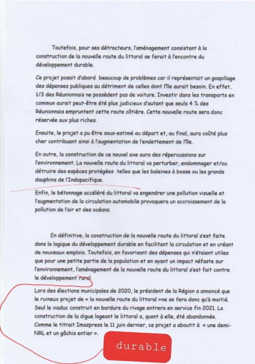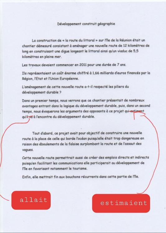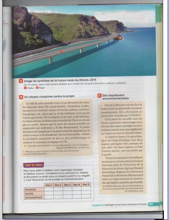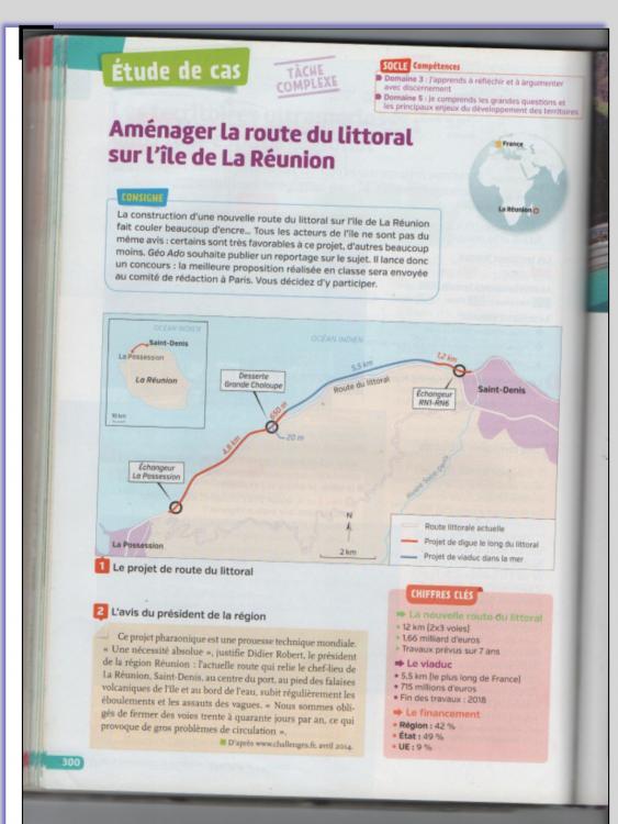 Bonsoir, je dois faire un développement construit en géographie sur la nouvelle route du littoral à la Réunion pour lundi. J'ai galéré à sortir quelque chose surtout que d'après les docs dans mon livres cette nouvelle route est sensée être terminée et qu'en définitive une partie de cette route sera en fonction fin 2021. J'ai galéré pour donner un ordre à mes idées et surtout pour employer les temps (verbaux). Quelqu'un aurait-il l'amabilité et sûrement aussi le courage de me lire et éventuellement de me corriger (ce serait le top!) Merci beaucoup, bonne soirée et bon week-end. Je vous joint l'énoncé (pas très clair pour moi), les 2 pages correspondantes dans mon livre et ma production (bof bof)