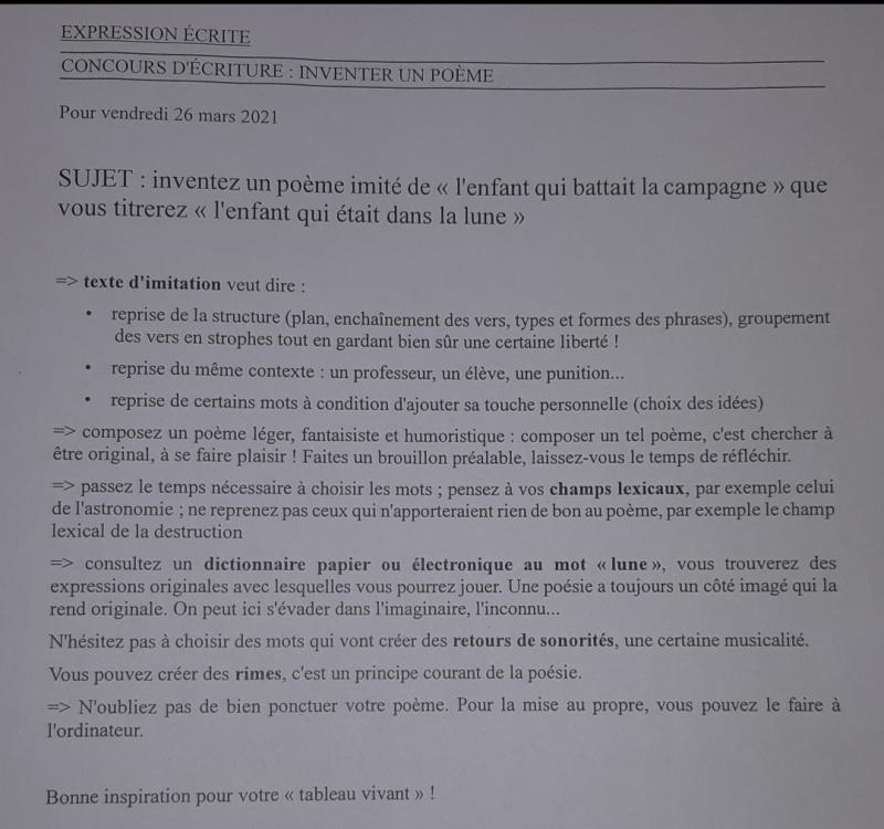 Bonjour à tous. Pour jeudi je dois inventer un poème qui sera intitulé l'enfant qui était dans la lune en imitant celui de Claude Roy l'enfant qui battait la campagne. Je vous poste les consignes, le poème l'enfant qui battait la campagne de Claude Roy et mon travail. Merci à tout ceux qui voudront bien me conseiller et me corriger.