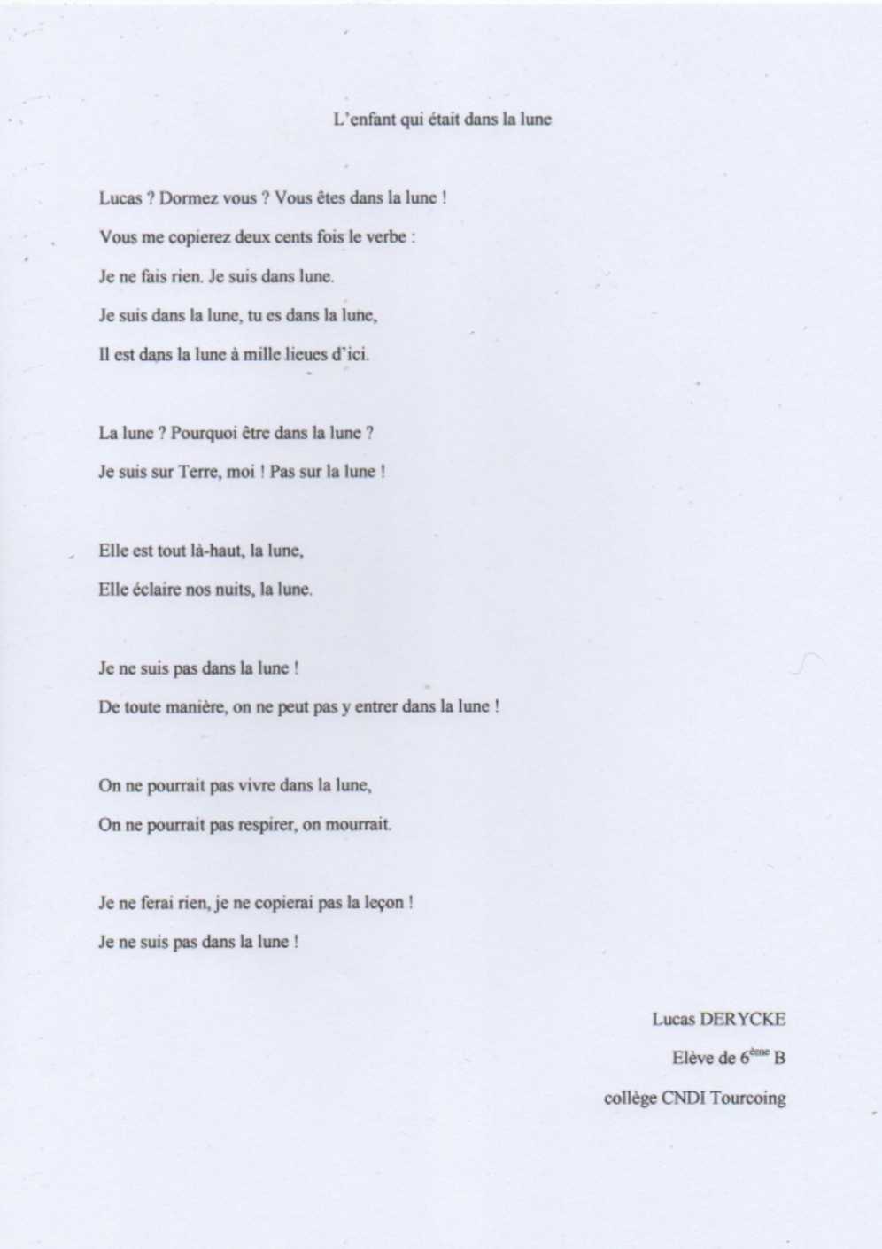 Bonjour Moîravita. Merci pour vos bons conque j'essaie de mettre en pratique. Je me permets de vous montrer ce que j'ai remanié (j'ai gardé les 5 premiers vers que j'aime bien) mais j'ai essayé de changer la suite et de lettre moins souvent "lune" Lucas? Dormez vous? Vous êtes dans la lune! Vous me copierez deux cents fois le verbe: Je ne fais rien. Je suis dans la lune. Je suis dans la lune, tu es dans la lune, il est dans la lune à mille lieues d'ici. La lune? Pourquoi y serais-je ? Je suis sur Terre, moi! Assis sur mon siège. Elle est loin de nous, la lune, Elle veille sur nos nuits, la lune. Je ne suis pas dans la lune, De toute manière, elle est impénétrable. (A partir d'ici je sèche...je me creuse les méninges ☹) et je termines par: Je ne ferai rien, je ne copierai pas la punition! Je ne suis pas dans la lune! Pouvez-vous s'il vous plaît me donner votre avis par rapport à mon premier poème? Merci -