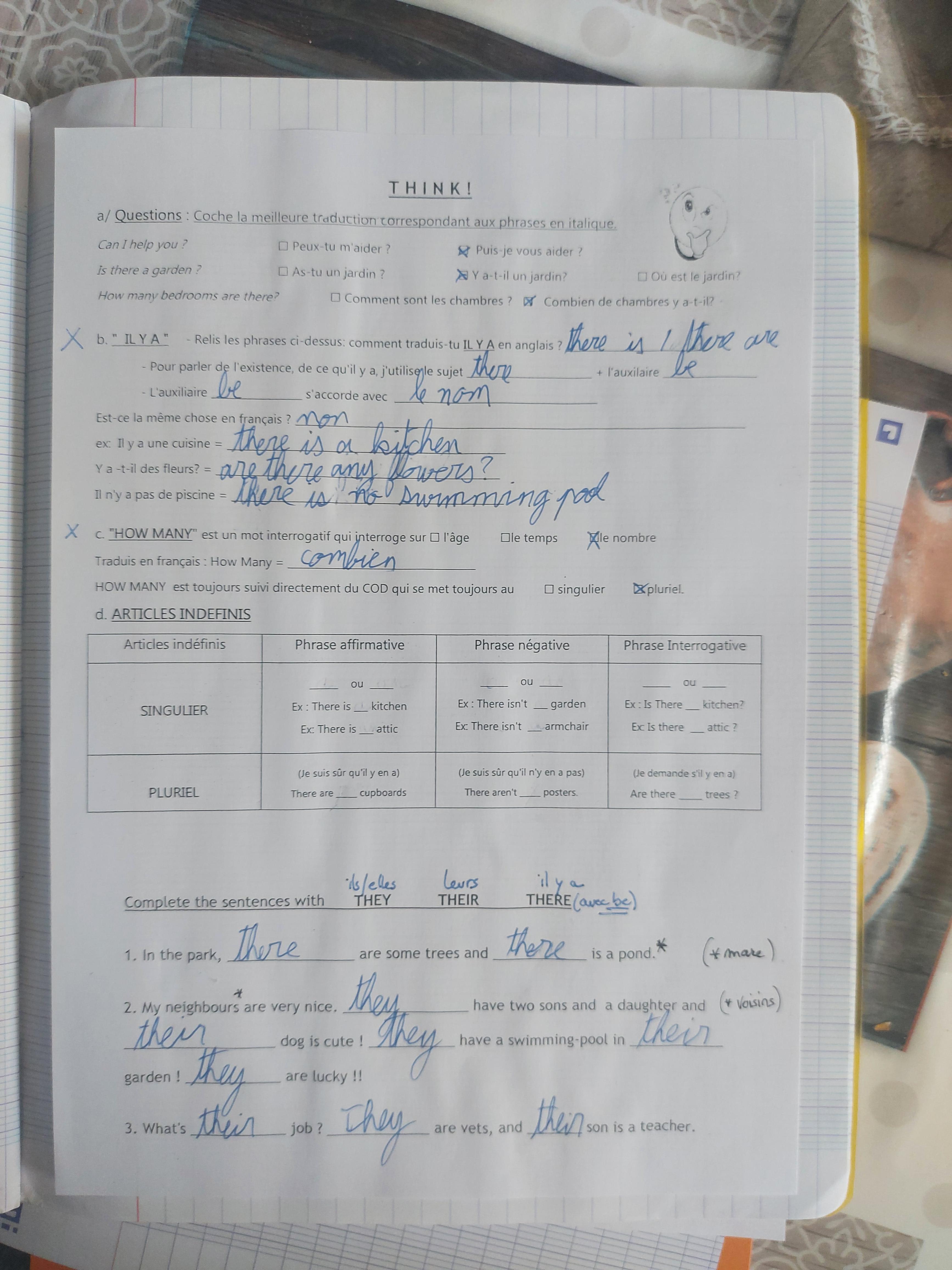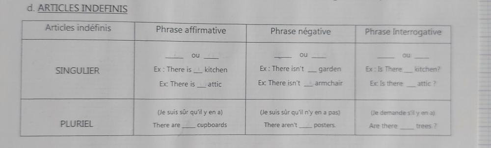 Bonjour, Pouvez-vous corriger les erreurs et compléter le tableau d) du poly ci-après car j'étais absent pour raison médicale le cours précédent et j'ai une interro sur there+be et how many vendredi et je n'ai plus cours d'anglais avant l'interro. Merci de votre aide. Lucas. 6ème