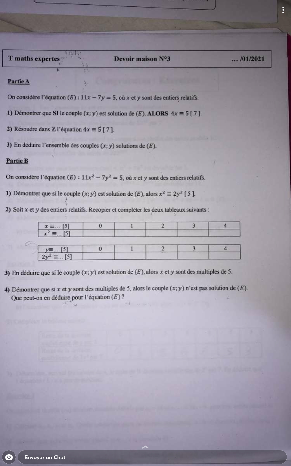 Bonjour je ai besoins de aide pour mon devoir de maths expert sur les congruences merci de votre aide pour toute les questions je N ai pas très bien compris