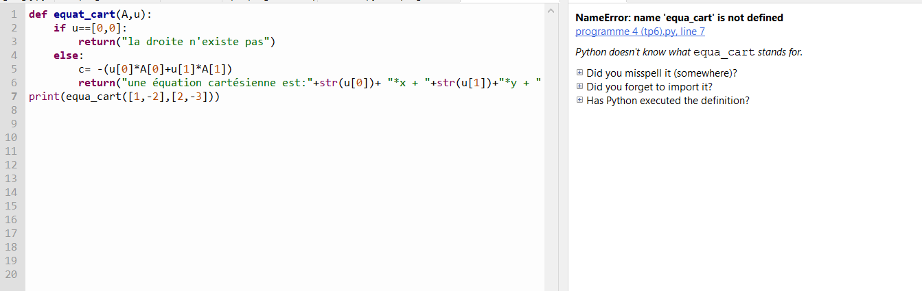 return("une équation cartésienne est:"+str(u[0])+ "*x + "+str(u[1])+"*y + "+str(c) +"=0")