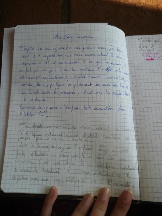 Bonjour j'espère que vous allez bien? Est ce que qu'elle qu'un pourrait m'aider a faire ce travail ou bien me donner un petit coup de pouce car j'ai pas compris. SVP . Merci de votre compréhensions. Cordialement. Consigne: A l'aider des document ci joints, rédiger la lettre d'Elsa pour sa cousine. Ton texte, de 20 lignes minimum, devra être structuré (plusieurs paragraphes traitant chacun d’une idée), argumenté, s’appuyer sur des exemples tirés des documents, justifiés scientifiquement, chiffres à l’appui quand c’est nécessaire. Après une brève introduction, 1) Tu montreras dans un premier paragraphe en quoi les croyances de la cousine d’Elsa(notées en caractères gras) sont fausses2) Puis tu montreras dans un deuxième paragraphe en quoi ses comportements et choix ne sont peut-être pas les plus adaptés pour sa santé et celle de son bébé. 3) Enfin, tu n’oublieras pas de mentionner dans une troisième partie, quels comportements pourraient améliorer sa santé et celle de son futur bébé, au sein de la deuxième partie ou bien dans une troisième partie.- N’oublie pas une petite phrase pour conclure ta lettre et signer. SVT travail.URL