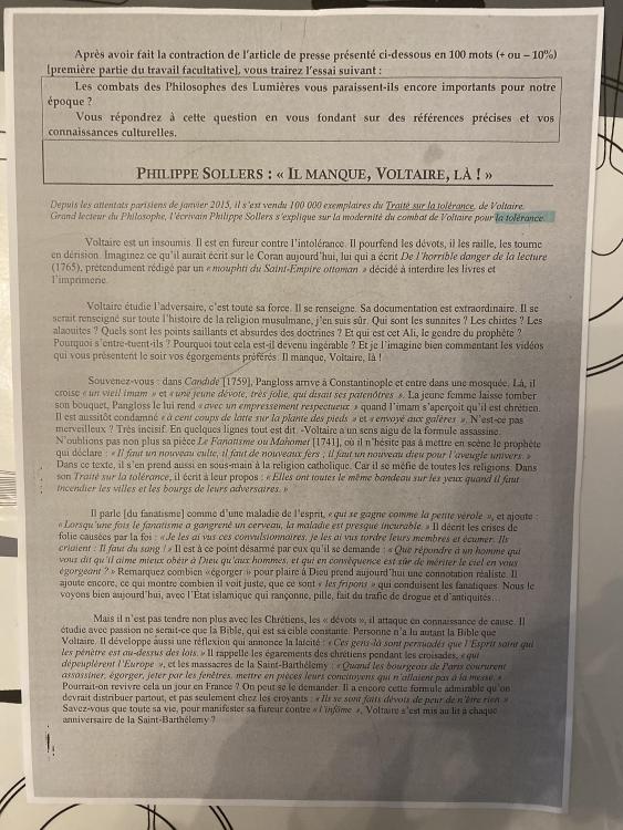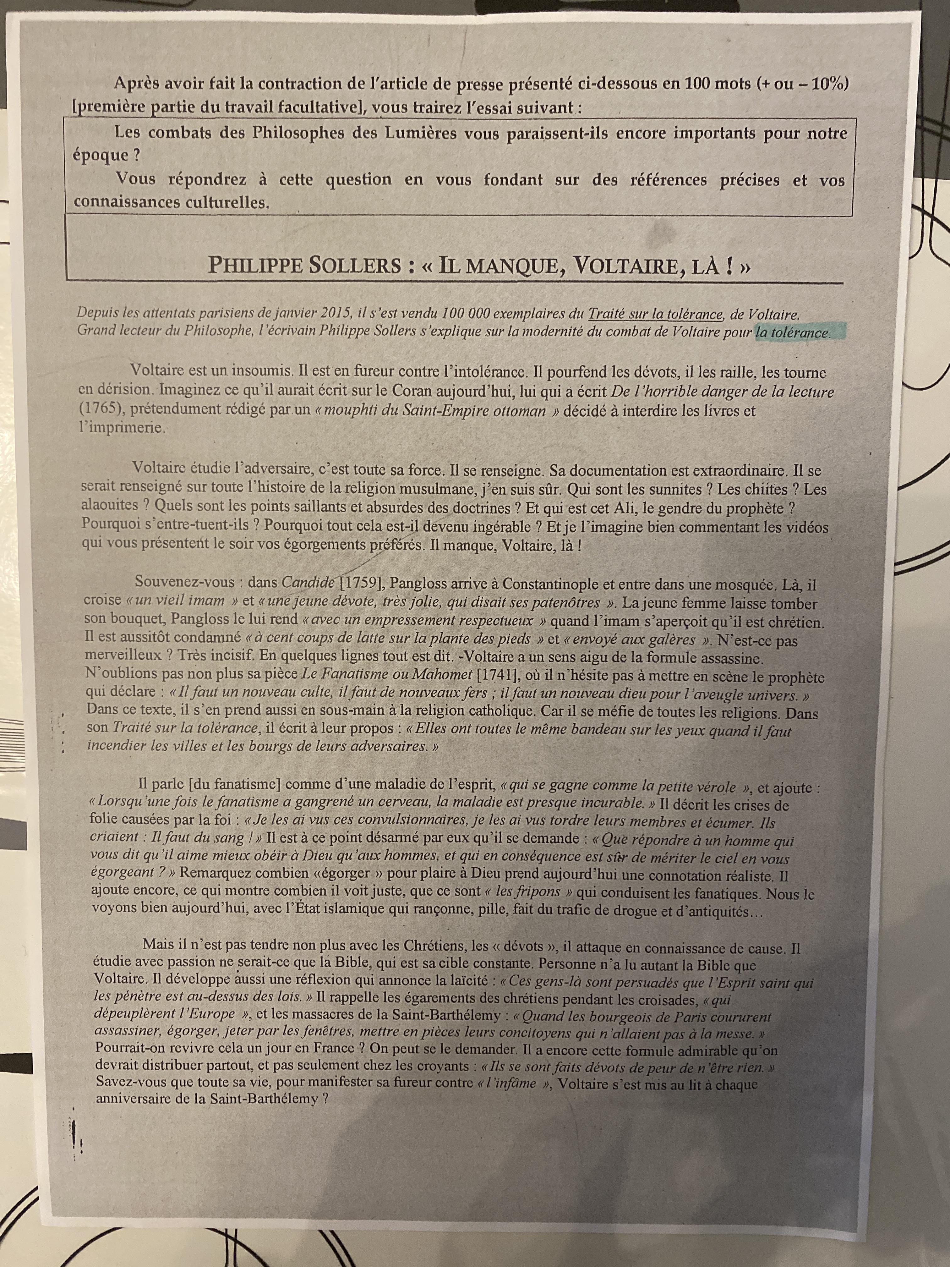 Bonjour je dois faire un essai en utilisant le plan dialectique sur ce texte de philippe sollers et répondre à la question suivante "Les combats des Philosophes des Lumières vous paraissent ils encore importants pour notre époque?"