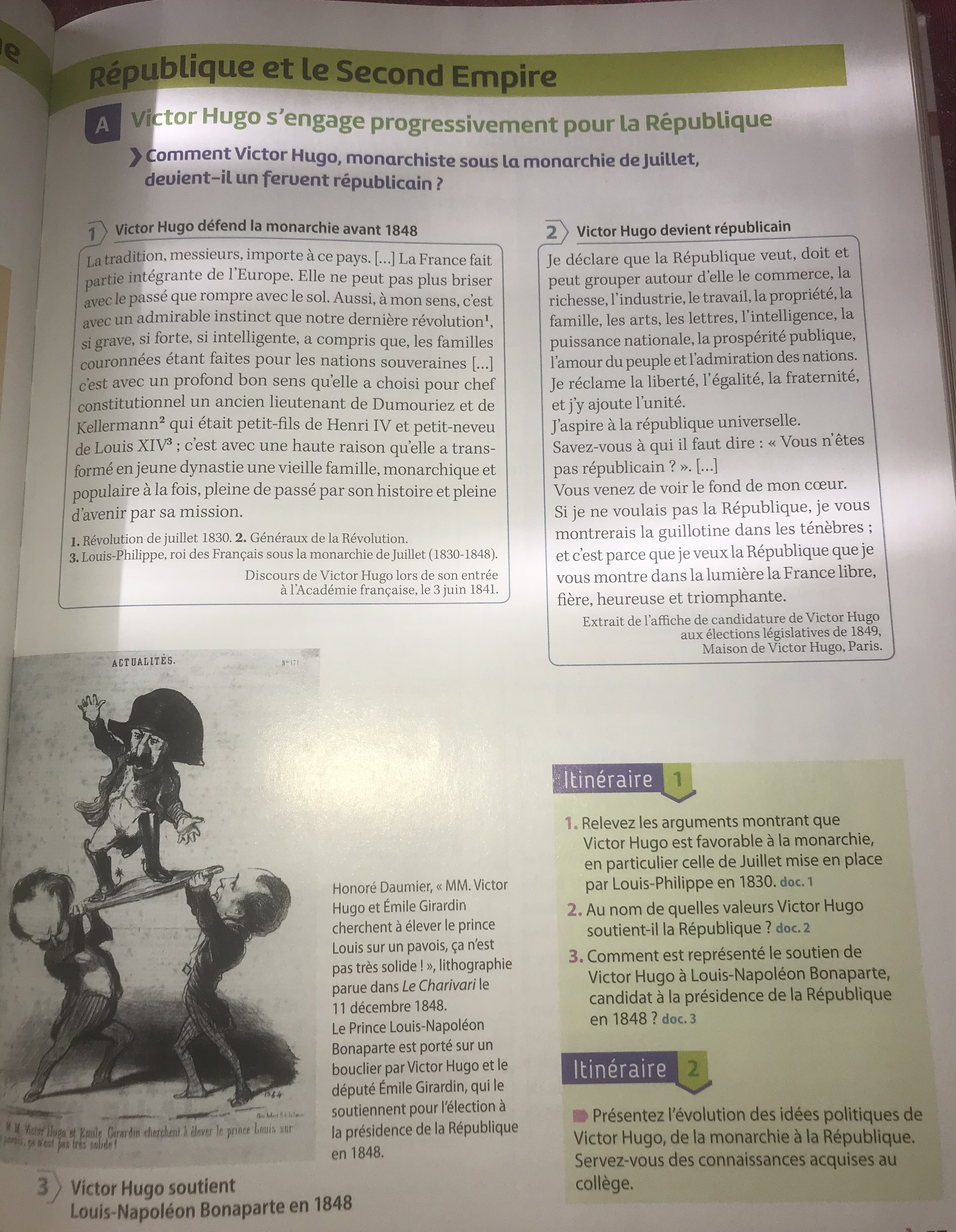 Bonjour à tous je bloque sur une question que je dois faire sous forme d’un grand paragraphe mais je ne la comprend pas vraiment : Comment Victor Hugo, monarchiste sous la monarchie de Juillet devient il un fervent républicain