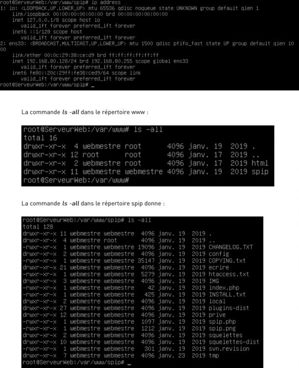 D’après la photo suivant (3 commande effectué), je voudrais identifier l’adresse mac de la carte réseau, l’adresse ip du serveur, le masque sous réseau, et les droits en octal du répertoire spip.