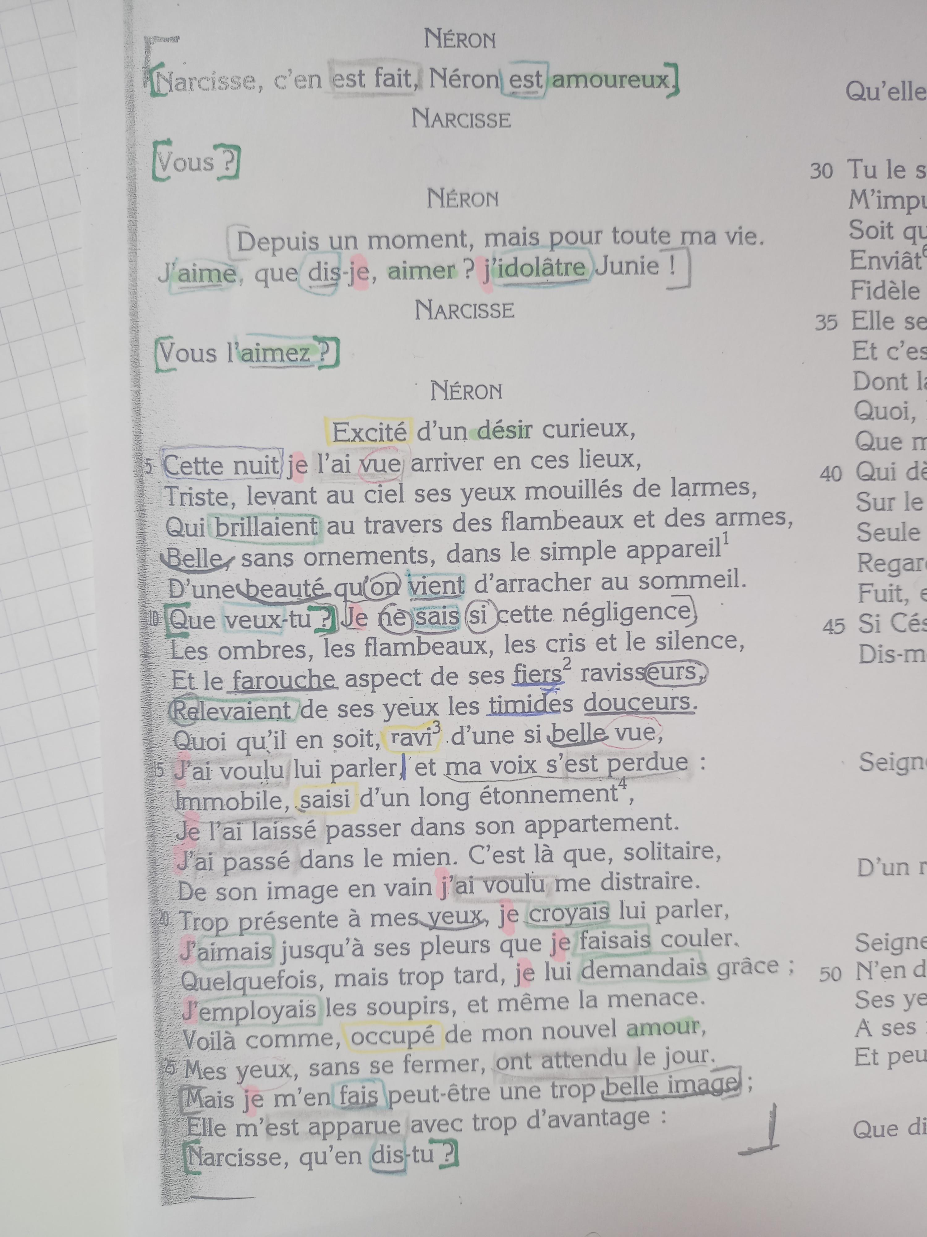 Bonjour, je dois faire un commentaire sur la scène 2 de l'acte 2 de Britannicus. J'ai fait l'intro et l'analyse linéaire au brouillon mais je bloque sur le plan, pouvez vous m'aider svp? voilà ce que j'ai fait pour le plan : (Problématique : comment Néron se confie-t-il à Narcisse?) 1- Récit en contraste A- entre le réel et la fiction B- 2- Expression de ses sentiments A- registre lyrique B- 3- Une passion virant à la folie A- B- Merci d'avance!