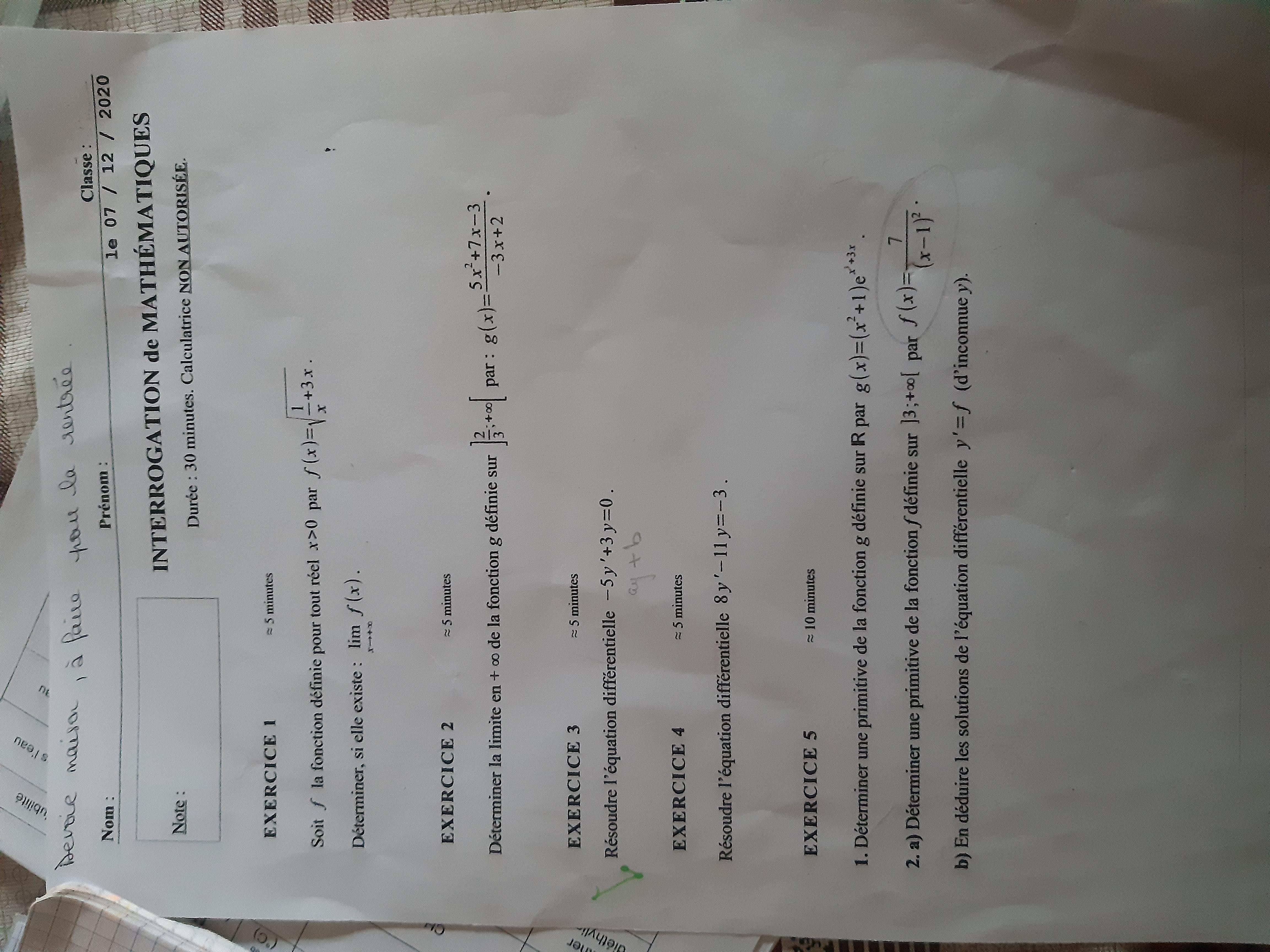 Bonjour, j'aimerai qu'on vérifie mes réponses à mon devoir maison svp. Exo 1: lim x-->+infini 1/x = 0 lim x-->+infini x=+infini donc lim x-->+infini 3x= +infini La fonction est donc égale à + infini Exo 2: g(x)=5x^2+7x-3/-3x+2 sur ]2/3;+infini [ En factorisant, je trouve : g(x)=x^2(5+7x/x^2 - 3/x^2) / x(-3+2/x) lim x-->+infini (5+7/x-3/x^2) = 5 lim x-->+infini (-3+2/x)=-3 donc lim x-->+infini x(-3+2/x)= + infini Par quotient, lim x-->+infini 5x^2+7x-3/-3x+2 = 0 Exo 3 : -5y'+3y=0 c'est de la forme y'=ay donc -5y'=-3y ce qui donne y'= -3/-5 y Exo 4: 8y'-11y=-3 c'est de la forme y'=ay+b 8y'=11y-3 --> y'= 11/8 y + 3/8 Exo 5: 1. g(x)=(x^2+1)exp (x^3+3x), sa primitive est 1/3 exp(x^3+3x) 2. a. F(x)=7/(x-1)^2 sa primitive est - 7/x-1 b. L'équation differentielle y'=f a comme solution y'= - 7/x-1 Si une personne pouvait me corriger si y a des erreurs svp