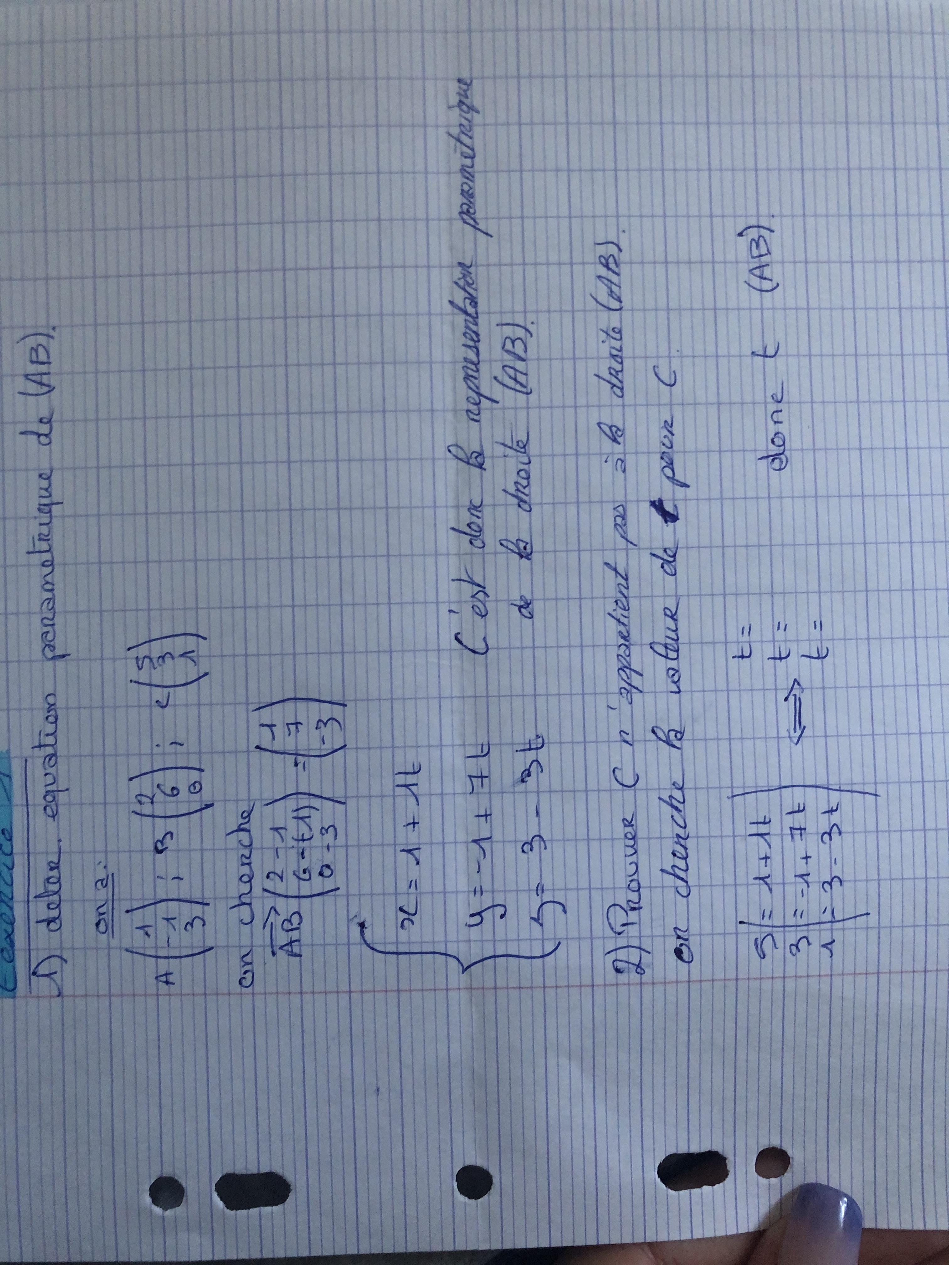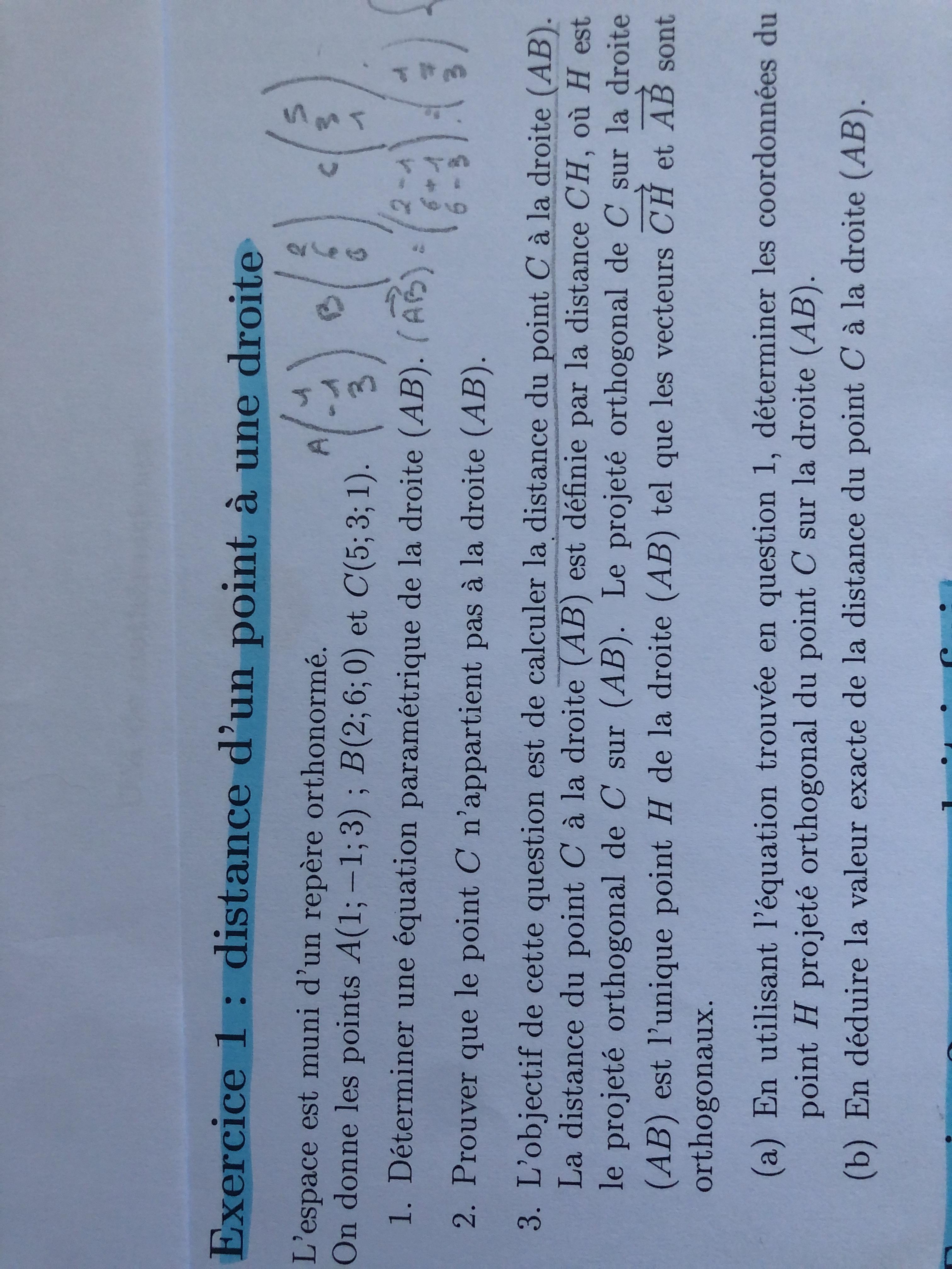 Bonjour je pourrais avoir de l’aide sur mon exercice de maths svp ? j’ai déjà commencé mais je bloque sur la fin. j’ai joint l’exercice et ma reponses au 2 premiers questions j’ai besoin d’aide pour la 3) a et b . 3) L’objectif de cette question est de calculer la distance du penser à la droite ( AB ). La distance du point C la droite, ( AB ) est définie par la distance CH ou H est le projeté orthogonal de C sur ( AB ). Le projeté orthogonal de C Sur la droite ( AB ) et l’unique point H de la droite ( AB ) Telles que les vecteurs CH et AB sont orthogonaux. A) EN utilisant l’equation trouver a la question 1,déterminer les coordonnées du point H projeté orthogonal du point C sur la droite ( AB ). B) En déduire la valeur exacte de la distance du point C a la droite ( AB ).