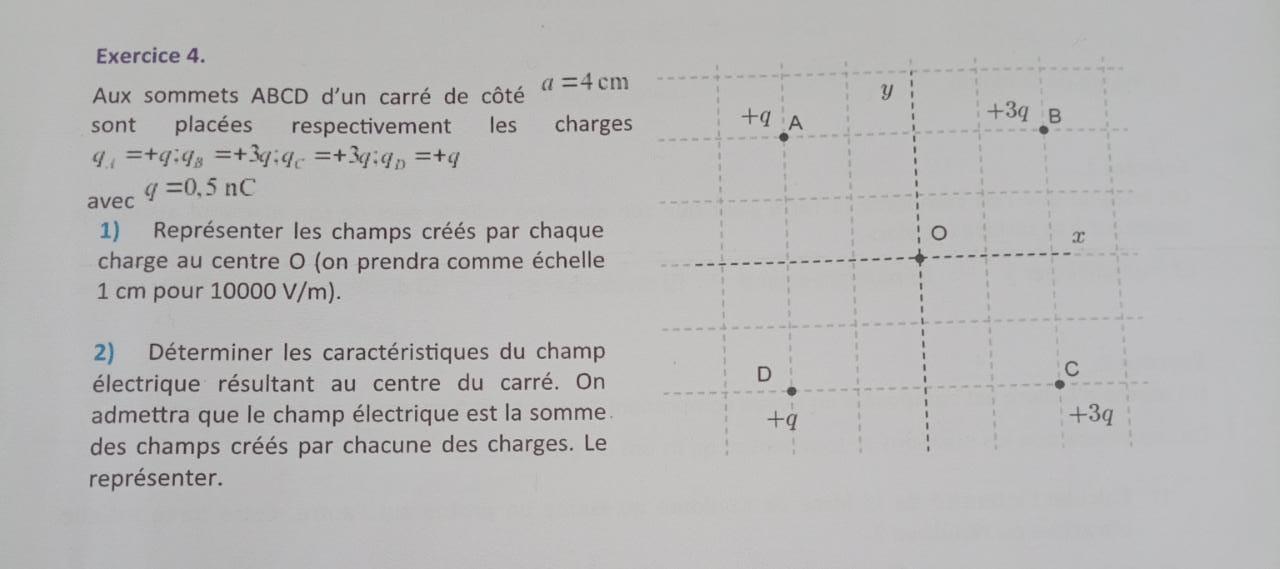 1. Bonjour, je suis en première générale, et il y a cet exercice de Physique Chimie que je n'arrive pas à résoudre. Pour la première question, j'ai essayé d'appliquer la formule E=(k*Q)/r^2 , mais le résultat ne va pas avec l'échelle (de l'ordre de 5 mm). J'ai trouvé r grâce à Pythagore. Pour la 2eme question, je ne voit pas que déterminer sur le champ