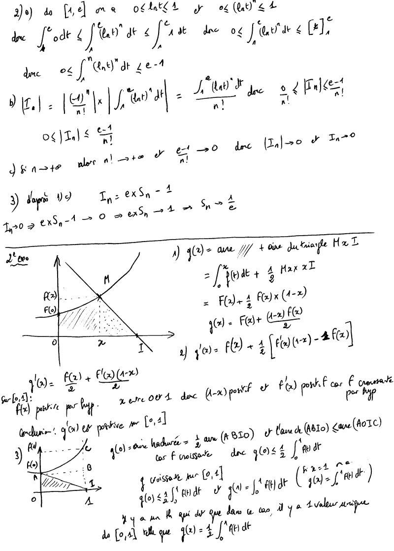 katana Posté(e) le 9 avril 2005 Auteur Signaler Posté(e) le 9 avril 2005 I(n+1) = I(n) + [((-1)^n+1)/(n+1)!] x e c) Montrer que que pour tout n on a I(n) = e((1/0!)-(1/1!)+(1/2!)-...+(-1^n/n!)) 2)a) Démontrer qe 0 < intégrale de 1 à e (ln t)^n dt < e - 1 (< = inférieur ou égal à...) B) en déduire que |I(n)| < (e-1)/n! ( la aussi < ceu dire inférieur ou éga a) c) que peut on en déduire pour la suite I(n) ? 3) Pour tout n, on pose
