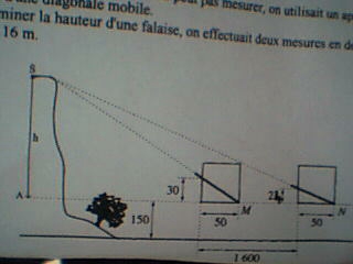 laitcacaoT Posté(e) le 5 novembre 2005 Signaler Posté(e) le 5 novembre 2005 pour calculer les distances quel'on ne peut pas mesurer,on ulisait un appareil constitué d'un carré muni d'une diagonale mobile.Pour determiner la hauteur d'une falsie, on effectuait deux mesures en deux points M et N distant de 16m. Inication:On designerapar d la distance AM 1)A l'aide des données ( en cm)indiquer sur le dessin,montrer en utilisant la propriété de Thales que la hauteur h verifie: h=30d/50 et h=24(d+1600)/50. voila si quelqu'un pouvait me venir en aide cela m'arrangerais bien pck je bloque completement.