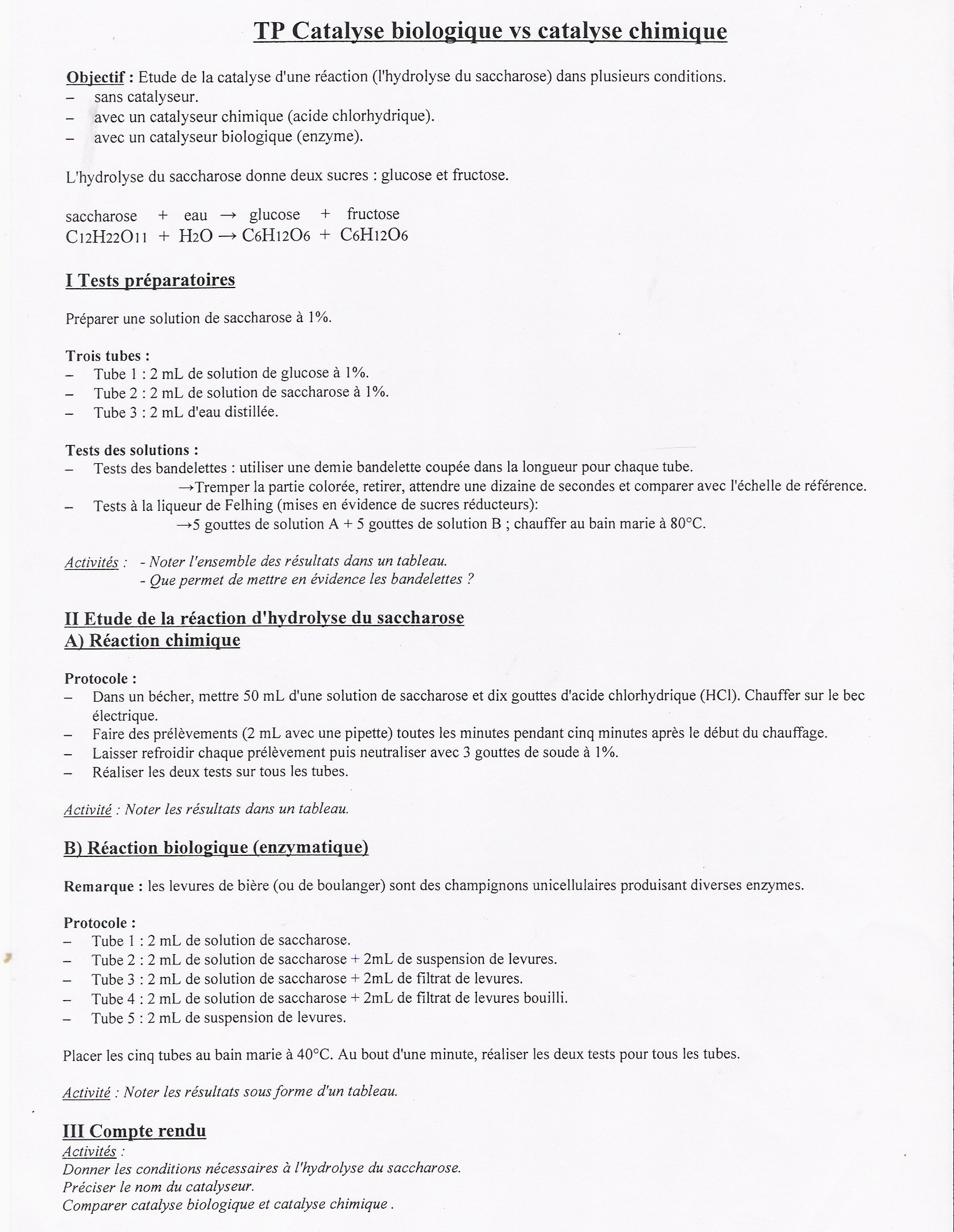 pierronimo Posté(e) le 17 octobre 2007 Auteur Signaler Posté(e) le 17 octobre 2007 Bonsoir, merci pour ta réponse si rapide ! juste quelque précisions: 1) ok 2) tu veux dire qu'il y a plus que 2catalyseur ? 3) je comprends ce que tu veux dire mais je ne vois pas comment tu veut que je fasse car on a pas fait la vitesse, les quantité n'ont pas été mesurées, on a juste regarder les couleurs des solutions et des bandes alors je vois pas comment faire et c'est quoi catalyse biologique et catalyse chimique ? merci pour ton aide ! PS: j'ai oublié de noter les résultats pour le II)A) (tête en l'air mais passionné de TP <3)!