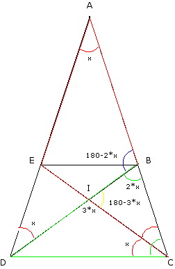 E-Bahut Barbidoux Posté(e) le 17 avril 2008 E-Bahut Signaler Posté(e) le 17 avril 2008 L’angle DAC =x, les alumettes EC et BD se coupent en I Le triangle ABD est isocèle ABD=180-2*x ABC sont aligné ==> l’angle DBC=2*x Le triangle AEC est isocèle ==> l’angle BCE=x Le triangle BDC est isocèle ==> l’angle DBC=BCD=2*x ==> L’angle ICD=2*x-x=x Dans le triangle BIC l’angle BIC=180-3*x comme l’angle BID est plat, l’angle CID=3*x. Le triangle CID est isocèle et la somme de ses angles vaut 5*x ==> x=180/5=36° A vérifier.....