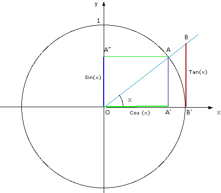 E-Bahut Barbidoux Posté(e) le 8 avril 2008 E-Bahut Signaler Posté(e) le 8 avril 2008 ------------------------------ Soit un système d’axe orthonormé (ox, oy) et un cercle de rayon unité appelé cercle trigonométrique. Un rayon OA fait un angle x avec l’axe ox. - La projection OA’ de ce rayon sur l’axe des x correspond au Cosinus de l’angle x noté Cos(x) - La projection OA” de ce rayon sur l’axe des y correspond au Sinus de l’angle x noté Sin(x) La droite tangente au cercle en B’ coupe le rayon OA en B. La distance BB’ correspond à la tangente de l’angle x notée tan(x) ----------------------------- En utilisant le théorème de Pythagore dans le triangle OAA’ tu en déduit que : OA2= OA’2+ AA’2 ==> 1=Cos(x)2+Sin(x)’2 ----------------------------- Les triangles OAA’ et OBB’ étant semblables tu en déduis que : AA’/BB’=OA’/OB’ ==> BB’=Tan(x)=OB’*AA’/OA’=1*Sin(x)/Cos(x)==> Tan(x)=Sin(x)/Cos(x) ------------------------- Conséquence : dans un triangle rectangle ABC, AC= AB*Cos(BAC)=AB*Cos(x) BC= AB*Sin(BAC)=Sin*Cos(x) BC/Sin*Cos(x)=AC/Cos(x) ==> BC=AC*Tan(x) ------------------------------ Relations métriques dans le cerce trigonométrique : Lorsque x=30° le triangle OAA’ est la moitié d’un triangle équilatéral donc AA’= Sin(30°)=1/2 Si tu appliques alors la relation Cos(x)2+Sin(x)’2 =1 tu obtiens Cos(30°)=(3)/2 et il est facile de démontrer que Sin(30°)=Cos(60°). Lorsque x=45° le triangle OAA’ est isocèle et OA’=AA’ ==> Sin(45°)=Cos(45°)= (2)/2 et finalement x................0...........30...............45..................60...........9 0 Sin(x).........0...........1/2........... (2)/2.... (3)/2.......1 Cos(x)........1........ (3)/2....... (2)/2.......1/2.............0 Tan(x)........0......... (3)/3.........1.................. (3)....... En espérant que cela t'aidera....