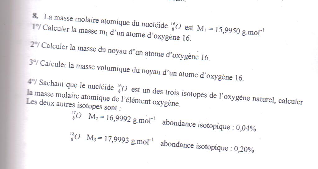 E-Bahut Boltzmann_Solver Posté(e) le 15 septembre 2009 E-Bahut Signaler Posté(e) le 15 septembre 2009 1) m_1A = M1/Na = .... g 2) 3) 4) M = (1-0.002-0.0004)*M1 + 0.0004*M2 + 0.002*M3 = ......g/mol Pour le 2 et 3, j'ai un doute pour le moment.