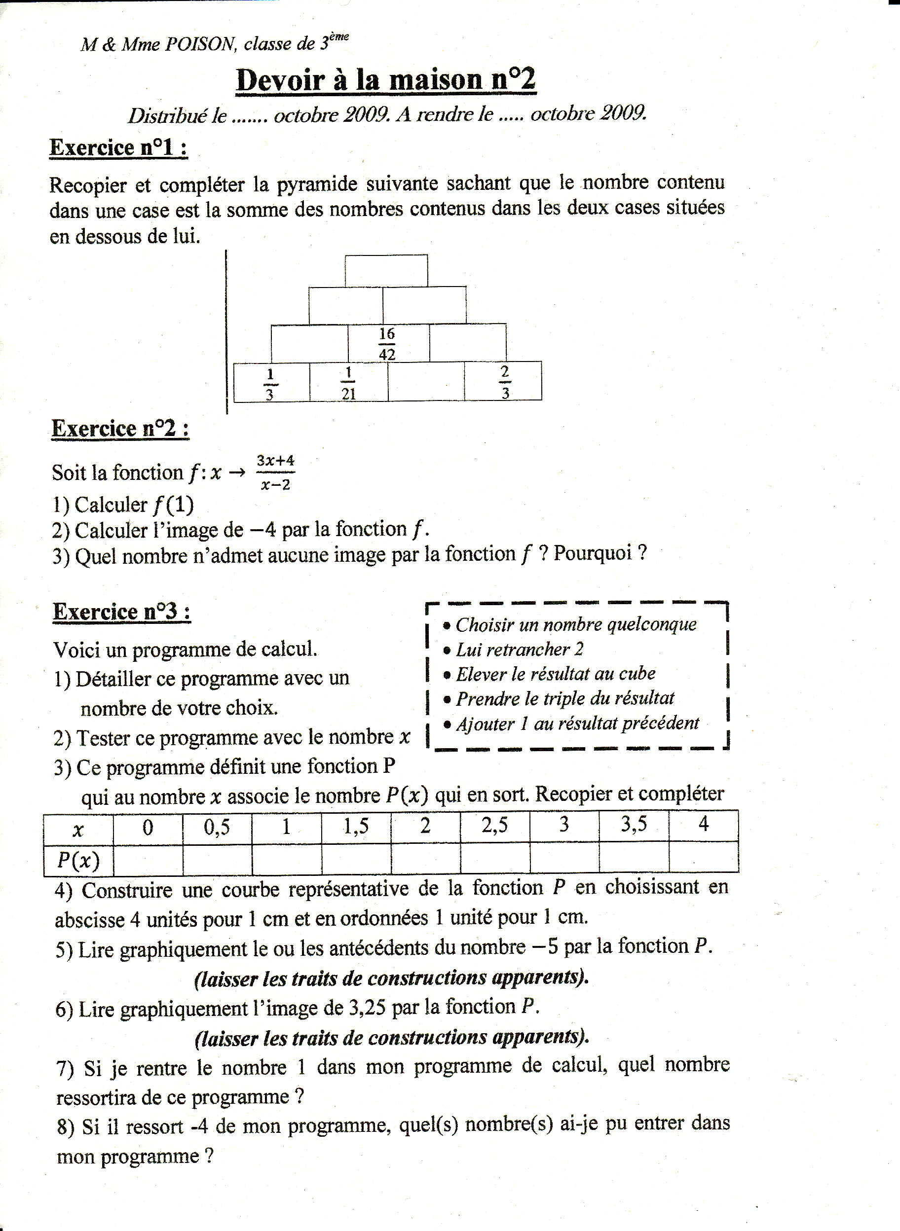 E-Bahut Barbidoux Posté(e) le 4 octobre 2009 E-Bahut Signaler Posté(e) le 4 octobre 2009 4-------------------------------- Voilà le graphe de la courbe représentative de P. En choisissant 1 cm pour l’unité des ordonnées il te faudra une feuille de 1500 cm de hauteur, cela fait beaucoup et c’est la raison pour laquelle je te disais qu’il doit y avoir un erreur d’énoncé..... 5-------------------------------- Lire graphiquement le ou les antécédents de -5 me semble là aussi problématique quant à calculer sa valeur cela donne P=3*(x-2)^3+1=-5 ==> (x-2)^3=-6/3=-2==> x=2-2^(1/3) et cela me semble dépasser les compétences d’un élève de troisième 6-------------------------------- Lire graphiquement l’image de 3,25 qui vaut 6,85938 sur ce graphe me semble tout aussi problématique.... 7-------------------------------- Là c’est plus facile P(1)=3*(1-2)^3+1=-2 8-------------------------------- Là encore problème P=3*(x-2)^3+1=-4 ==>(x-2)^3=-5/3 ==> x=2-(5/3)^(1/3). Là encore cela me semble dépasser les compétences d’un élève de troisième....