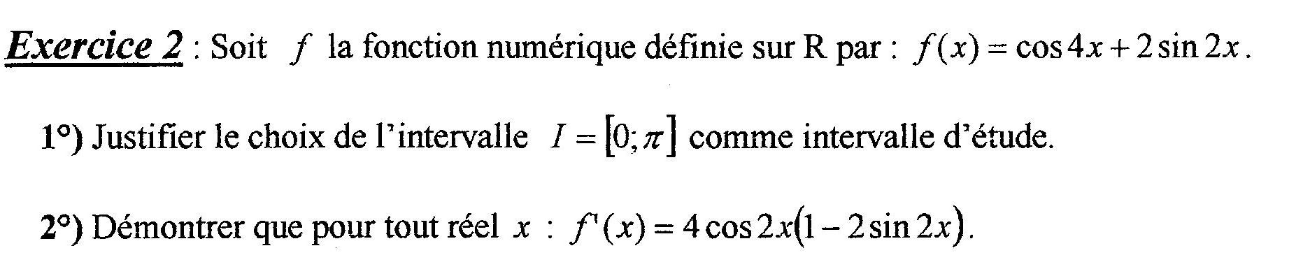 E-Bahut Boltzmann_Solver Posté(e) le 3 octobre 2009 E-Bahut Signaler Posté(e) le 3 octobre 2009 1) j'ai deja trouvé que f est impaire donc que sa courbe est symétrique par rapport à l'origine après f(x+pi)=(cos4x+pi)+2sin(2x+pi) et après c'est ici que je n'y arrive plus Tu as fait une erreur. Il faut appliquer le produit à pi aussi!!! Pour quelque soit x app à R : f(x+pi)=cos(4x+4pi)+2sin(2x+2pi) = cos(4x)+2sin(2x) = f(x). Donc, on peut réduire l'intervalle d'étude sur un domaine de longueur Pi par périodicité. 2) on pose u(x)=cos(4x) u'(x)=4(-sin(4x)) v(x)=2sin(2x) v'(x)=4sin(2x) Erreur : f'(x) = -4*sin(4x) + 2*2*cos(2x) f'(x)=4(-sin4x)+4sin2x
