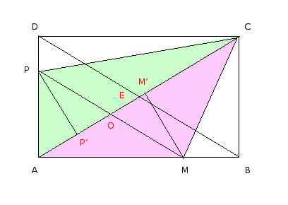 E-Bahut Barbidoux Posté(e) le 10 octobre 2009 E-Bahut Signaler Posté(e) le 10 octobre 2009 Exercice 1 ----------------------------------------- Le triangle EDC ne peut pas être isocèle en E car EDC ECD Le triangle EDC ne peut pas être isocèle en C car DEC=Pi-(EDC+ECD) EDC -------------- AB//DC ==> Les triangles EAB et EDC sont semblables ==> EA/ED=EB/EC=AB/DC ==> EA/(EA+AD)=AB/DC ==> EA/(EA+4)=6/10 ==> x/(x+4)=6/10 ==> 10*x=6*x+24 ==> x=6 ==> DE=10 et ECD est isocèle en D ------------------------------------------ Exercice 2 ----------------------------------------- PM et AC se coupent en O, DB et AC en E. On appelle P' le projeté orthogonal de P sur AC et M' le projeté orthogonal de M sur AC Les triangles AOP et AED sont semblables AP/AD=AO/OE=OP/ED ainsi que les triangles AOM et AEB ==>AO/OE=AM/AB=OM/EB ==> OP/ED= OM/EB et comme ED=EB ==> OP=OM Les triangles rectangles PP'O et MM'O qui ont un les angles POP' et MOM' égaux et leur hypothénuse égale OP=OM sont isométriques ==> PP'=MM' En conclusion: Surface de CPA=CA*PP'/2=Surface de CMA=CA*MM'/2 ----------------------------------------- Exercice 3 ----------------------------------------- Les triangles TRB et TIC sont semblables ==> TB/TC=RB/IC=TR/TI Les triangles SAR et SIC sont semblables ==> SC/SA=SI/SR=IC/RA ==> (TB/TC)* (SC/SA)=(RB/IC)*(IC/RA)=RB/RA ==>(TB/TC)* (SC/SA)*(RA/RB)=1 -------------- (TB/TC)=(SA/SC)*(RB/RA)=(2,5/1,5)*(3/2)=2,5