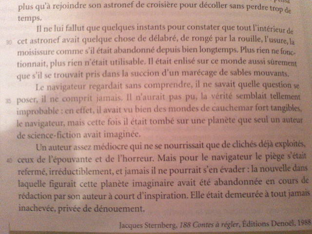 E-Bahut Papy BERNIE Posté(e) le 22 octobre 2009 E-Bahut Signaler Posté(e) le 22 octobre 2009 Bonjour, je t'aide une fois , pas deux . OK ? Le français n'est pas mon domaine. La prochaine fois, tu trouveras qq. d'autre ou tu feras ce que tu peux toute seule. Toujours OK? A la rigueur , je pourrais accepter de corriger tes réponses envoyées mais sûrement pas de te donner mes réponses. Encore OK? Pour finir, si mes réponses ne sont pas celles attendues par le prof, tant pis : je n'y peux rien. Je précise pour toute personne autre que hin63 qui lirait ma réponse que j'interviens à la suite d'une demande par message perso de cette élève. Et que le français n'est pas mon domaine. 1)L'action se déroule sur une planète sans nom, quelque part dans l'espace. Tu cherches seule les phrases du texte qui l'indiquent. QUAND ? Je n'en sais rien . Je n'ai pas trouvé. 2) Il s'agit du type "nouvelle fantastique" , d'une nouvelle de science-fiction . 3) lambeaux d'arbre morts-végatation en décomposition-brume opaque-ciel d'orage-marais visqueux-créatures larvaires termes qui appartiennent au "champ lexical de l'horreur" Impression dominante : l'horreur, la peur qu'elle engendre. 4) Les poncifs : présence de créatures horribles inconnues sur Terre, paysage de brume au ciel noir, odeur horrible... 5) L'imparfait est justifié ici par une description du cadre du récit qui a lieu dans le passé. Le passage au passé simple à partir de la ligne 26 se justifie pour parler des actions entreprises par le héros de la nouvelle : actions précises du passé , délimitées dans le temps (=qui ne s'étalent pas dans la durée). 6) Il est dans un monde de décomposition où l'astronef ne peut que de délabrer donc d'abord rouiller. Eléments qui le prouvent : arbres morts-plantes qui semblaient agoniser- moisissure ambiante. Voilà , j'en ai fini. Tu aurais pu trouver une bonne partie de tout ça seule. Alors que là, tu vas te contenter de recopier !! Dommage. Papy Bernie.