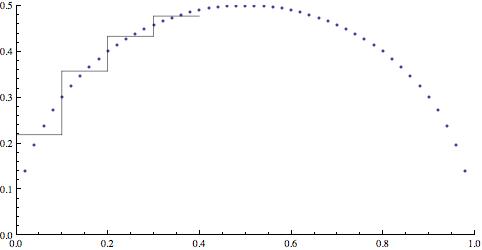 E-Bahut Barbidoux Posté(e) le 25 octobre 2009 E-Bahut Signaler Posté(e) le 25 octobre 2009 Partie 2--------------------- On lit les encadrements sur le tableau des valeurs de f(x) La fonction g est constante sur l'intervalle [0,1*k; 0,1*k+0,1] où k est tel que 0 k <10 et sa valeur moyenne est la valeur g(x+0,5*k). Pour k= 0, g(0,05)=f(0,05) Graphe du début de g(x) et de f(x)
