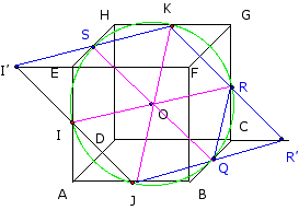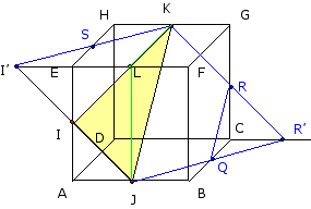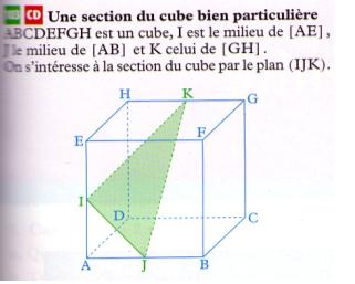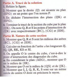 E-Bahut Barbidoux Posté(e) le 29 octobre 2009 E-Bahut Signaler Posté(e) le 29 octobre 2009 1-------------------------- Cube d'arrête a 2-------------------------- IJ qui appartient au plan EABF coupe FE en I' . La doitr EF appartenant au plan EFG , I' appatient à ce plan et IJ est secante à ce plan en I'. 3-------------------------- I', et H K appartiennent aux plan EFG et IJK et la droite I'K est l'intersection de ces deux plans. Pour terminer la section du cube par le plan IJK on trace dans le plan GHDC la // à I'J passant par K qui coupe GC en R puis, dans le plan CDAB la // à I'K passant par J qui coupe BC en Q. KR et JQ se coupent en R' qui appartient à DC ---------------- Partie B ----------------- 1-------------------------- Soit L la projection orthogonale de J sur EF. Les triangles I'EI et I'LJ sont semblables ==> I'E/I'L=EI/LJ=1/2 ==> I'E=a/2 Les triangles rectangles I'EI et KGR ont leur 3 côtes // et un côté égal (I'E=KG=a/2) ils sont donc isométriques et R est le milieu de GC. Les triangles rectangles ESI et QRC ont leur 3 côtes // et un côté égal (IE=RC=a/2) ils sont donc isométriques et QR est le milieu de BC. 2-------------------------- Il s'en suite que IJ=JQ=QR=RK=KS=SI et comme IJ est la diagonale d'i-un carré de côté a/2 ==> IJ= (2 (a^2)^2) = a 2/2 3-------------------------- O est le point d'intersection des diagonales du cube donc des diagonales du triangle EGCA donc le milieu de IR. Les quadrilatères OSI'I, OSKR, ORR'Q et OQJI sont des losanges et OI=OS=OK=OR=OQ=OJ et tou -ces points se trouvent sur un cercle de rayon OI= a 2/2 où ils dessinent un hexagone régulier puisque IS=SK=KR=RQ=QJ=JI