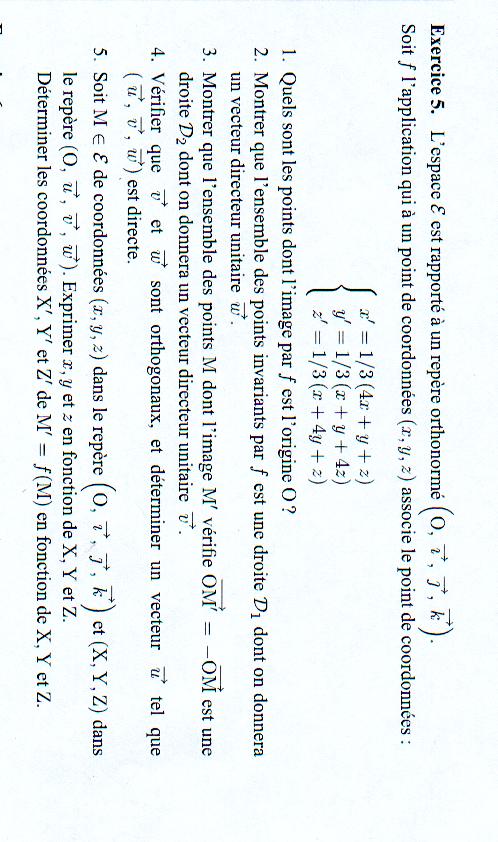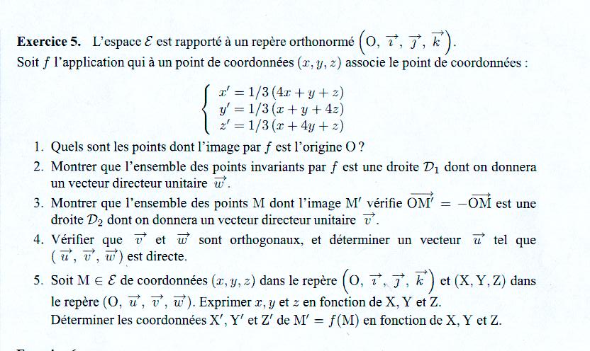 marissa10 Posté(e) le 14 novembre 2009 Signaler Posté(e) le 14 novembre 2009 Bonjour à tous, je suis bloquée sur un problème et je ne vois pas trop comment le traiter. Le voici :L'espace E est rapporté à un repère orthonormé (O, vecteur i, vecteur j, vecteur k).Soit f l'application qui à un point de coordonnées (x, y, z) associe le point de coordonnées :x' = 1/3 (4x+y+z)y' = 1/3 (x+y+4z)z' = 1/3 (x+4y+z)1) Quels sont les points dont l'image par f est l'origine O ?2) Montrer que l'ensemble des points invariants par f est une droite D1 dont on donnera un vecteur directeur unitaire vecteur w.3) Montrer que l'ensemble des points M dont l'image M' vérifie vecteur (OM') = - vecteur (OM) est une droite D2 dont on donnera un vecteur directeur unitaire vecteur v.4) Vérifier que vecteur v et vecteur w sont orthogonaux, et déterminer un vecteur vecteur u tel que (vecteur u, vecteur v, vecteur w) est directe.5) Soir M appartenant à E de coordonnées (x, y, z) dans le repère (O, vecteur i, vecteur j, vecteur k) et (X, Y, Z) dans le repère (O, vecteur u, vecteur v, vecteur w). Exprimer x, y et z en fonction de X, Y et Z.Déterminer les coordonnées X', Y' et Z' de M' - f(M) en fonction de X, Y et Z.J'ai à peine commencé le 1) croyant avoir compris, mais je trouve un point unique : (0, 0, 0) alors que la question disait les points (au pluriel). Donc dès le départ j'ai faux.Merci d'avance pour votre aide.