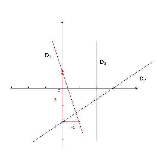 LAURA1994 Posté(e) le 2 décembre 2009 Auteur Signaler Posté(e) le 2 décembre 2009 Le -b/3 marche car il coupe l'axe des abscisses (1ère composante nul) Pour D1, on a une descente de 3 graduations pour 1 graduation de progression vers la droite. Donc a = (-3)/1 = -3. Pour D2, on a une montée de 2 graduations pour 3 graduation de progression vers la droite. Donc b = 2/3. Vous comprenez pourquoi maintenant? Sauf que pour D2, il y avait une petite astuce lié à l'intersection sur l'abscisse.