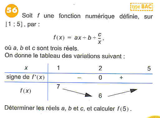 Ericovitchi Posté(e) le 4 janvier 2010 Signaler Posté(e) le 4 janvier 2010 Grâce au tableau, tu sais beaucoup de choses. Presque trop d'ailleurs. Tu vois que la fonction vaut 7 pour x=1 et 6 pour x=2 Tu vois que la dérivée s'annule pour x=2 donc écris f(1)=7 ; f(2)=6 ; f '(2)=0 et tu auras bien assez d'équations pour trouver a et b