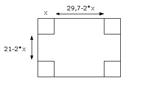 E-Bahut Denis CAMUS Posté(e) le 5 janvier 2010 E-Bahut Signaler Posté(e) le 5 janvier 2010 Bonsoir, avec les carrés enlevés, la surface de base a pour dimensions : l - 2x (l=21) L-2x (L=29,7) Le volume est donc : longueur * largeur * hauteur soit : (L-2x)(l-2x)x = 1000 x(L*l - 2x*L - 2x*l + 4x²) = 1000 4x³ -2x²L -2x²l + x*L*l -1000 = 0 On remplace par 21 et 29,7 et il faut se résoudre à résoudre. Denis