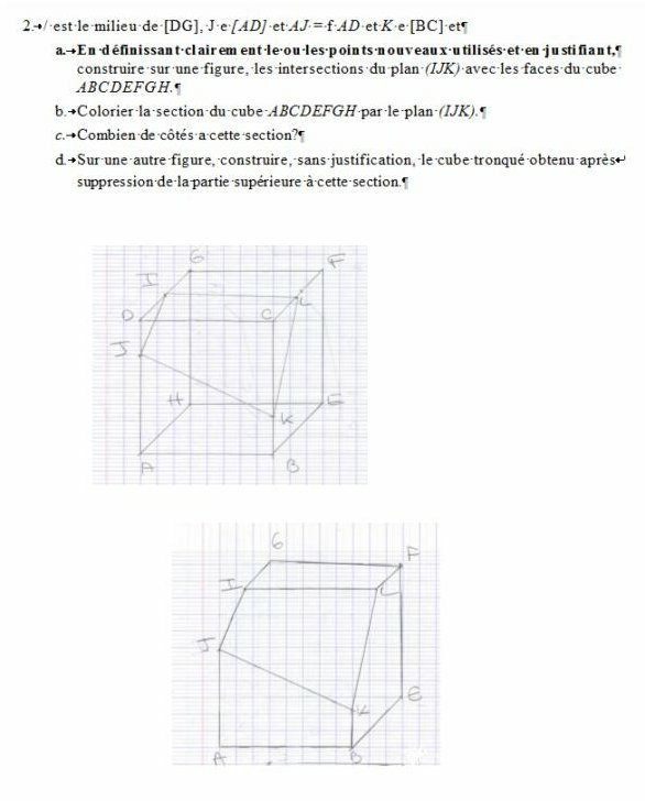 E-Bahut Barbidoux Posté(e) le 6 janvier 2010 E-Bahut Signaler Posté(e) le 6 janvier 2010 Bonjour, pouvez vous me dire si mes figures sont juste ? J'ai mis dans les piéce jointe le sujet & en dessous les figures. Je voudrais savoir si c'est juste & si la droite (IL) peut étre paralléle a la doirte (JK) ? Est ce que si le cube tronqué peut étre sous forme de carrée ? Merci Laura Bonne Année & bonne santé