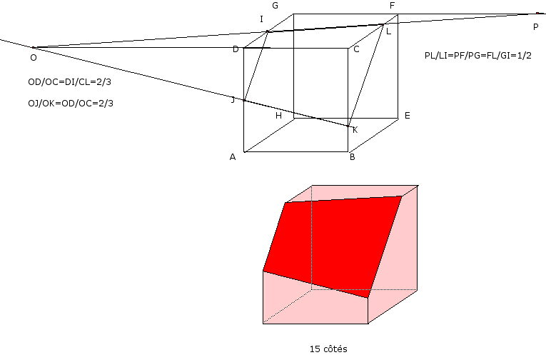 LAURA1994 Posté(e) le 6 janvier 2010 Auteur Signaler Posté(e) le 6 janvier 2010 je me suis trompée en vous donnant I est le milieu ....... désolé ! Je vous réécris l'énoncé entier construire le cube ABCDEFGH sur votre copie et les points I,J et K tels que : I est le milieu de [DG], J app [AD] et AJ =3/4 AD et K app [bC] et BK = 1/4 BC a) En définissant clairement le ou les points nouveaux utilisés et en justifiant, construire une figure, les intersections du plan (IJK) avec les faces du cube ABCDEFGH. b) colorier la section du cube ABCDEFGH par le plan (IJK) c) combien de côtés a cette section ? d) Sur une autre figure, construire, sans justification, le cube tronqué obtenu après suppression de la partie supérieure à cette section. Pour le a) j'ai répondu : Appeler L le point d'intersection de (CF) avec la droite parallèle à (IJ) passant par K le plan (IJKL) coupe la face CFGO du polyèdre en [iL] le plan (IJKL) coupe la face ABCO du polyèdre en [JK] le plan (IJKL) coupe la face BEFC du polyèdre en [LK] le plan (IJKL) coupe la face AHGO du polyèdre en [JI] Merci