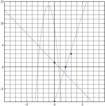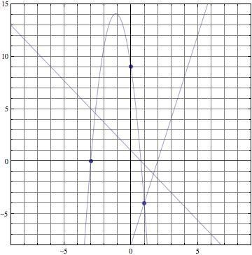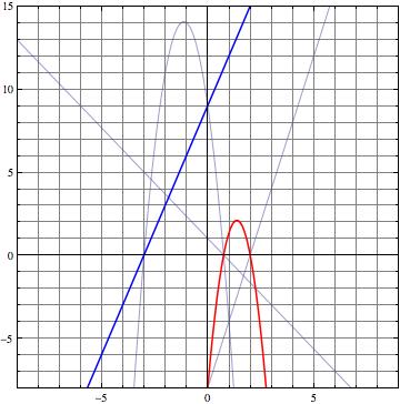 E-Bahut Barbidoux Posté(e) le 20 janvier 2010 E-Bahut Signaler Posté(e) le 20 janvier 2010 La parabole passe par les points {0,9}, {-3, 0} et {1,-4} son équation étant de la forme f(x)= a*x^2+b*x+c on en déduit que c=9 et que 9*a - 3*b + 9 = 0 et a + b + 9 = -4 ==> a=-4 et b=9 donc g(x)=-4*x^2+9*x+9 ------------------------- La droite d2 passe par les points {0,1} son équation est donc y=a*x+1 et elle passe par le point {3,-3} ==> a=-4/3 ==> f2(x)=-4*x/3+1 La droite d1 passe par le point {0,-8} son équation est donc y=a*x-8 et elle passe par le point {2,0} et a=4 ==> f1(x)=4*x-8 ------------------------- f(x)=f1(x)*f2(x)=(4*x-8)*(-4*x/3+1) Le graphe de f(x) coupe l’axe des abscisses aux points d’intersection des graphes de f1(x) et de f2(x) avec l’axe des abscisses. ----------------------- g(x)=(-4*x/3+1)*(a*x+b)=-4*x^2+9*x+9 ==> b=9 et a=3