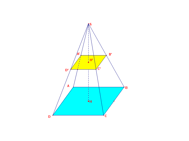 E-Bahut Boltzmann_Solver Posté(e) le 25 janvier 2010 E-Bahut Signaler Posté(e) le 25 janvier 2010 On Considére une pryramide réguliére SABCD A base carrée. On Donne HS=12cm et AB=4cm. 3°)Calculer le volume de la pyramide SABCD. 5°) Calculer, en justifiant, la longeur SA D'une arête latérale. 6°) On Suppose que le point H' Est au milieu de [HS]. Calculer en justifiant le volume de la petite pyramide SA' B'C'D'.