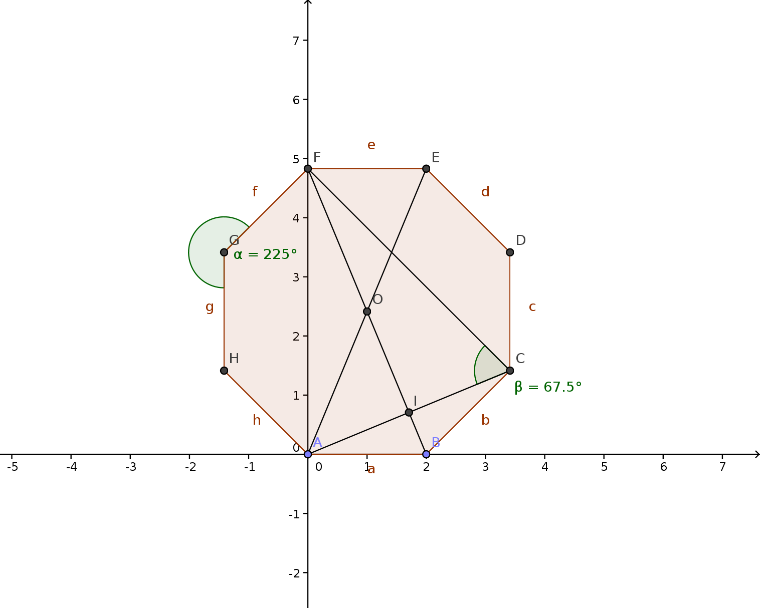 E-Bahut Boltzmann_Solver Posté(e) le 16 février 2010 E-Bahut Signaler Posté(e) le 16 février 2010 (CA,CF). Première chose : L'angle est négatif car il est orienté dans le sens horaire. On définit O comme le centre du polygone. Ensuite. Dans le triangle OAB, on peut dire que : * angle(AOB) = 2pi/8 (Par symétrie du polygone régulier) * OAB est isocèle en O. Donc, angle(OAB) = angle(OBA) = (pi - angle(AOB))/2 = 6pi/(8*2) = 3pi/8 Ensuite, par symétrie, OF=OE=OB=OA ==> ABFE est un rectangle et donc FAB est un triangle rectangle et FEB aussi (et semblable à FAB). Donc angle(AFC) = 2*angle(AFB) Or dans le rectangle FAB, pi = pi/2 + angle(AFB) + angle(FBA) = pi/2 + angle(AFB) + 3pi/8 ==> + angle(AFB) = pi/8 ===> angle(AFC) = pi/4. Or, toujours pas symétrie, le triangle AFC est isocèle en F. Donc angle(FCA) = (pi-angle(AFC))/2 = 3pi/8 Donc (CA,CF) = -3pi/8 A toi d'y réfléchir.