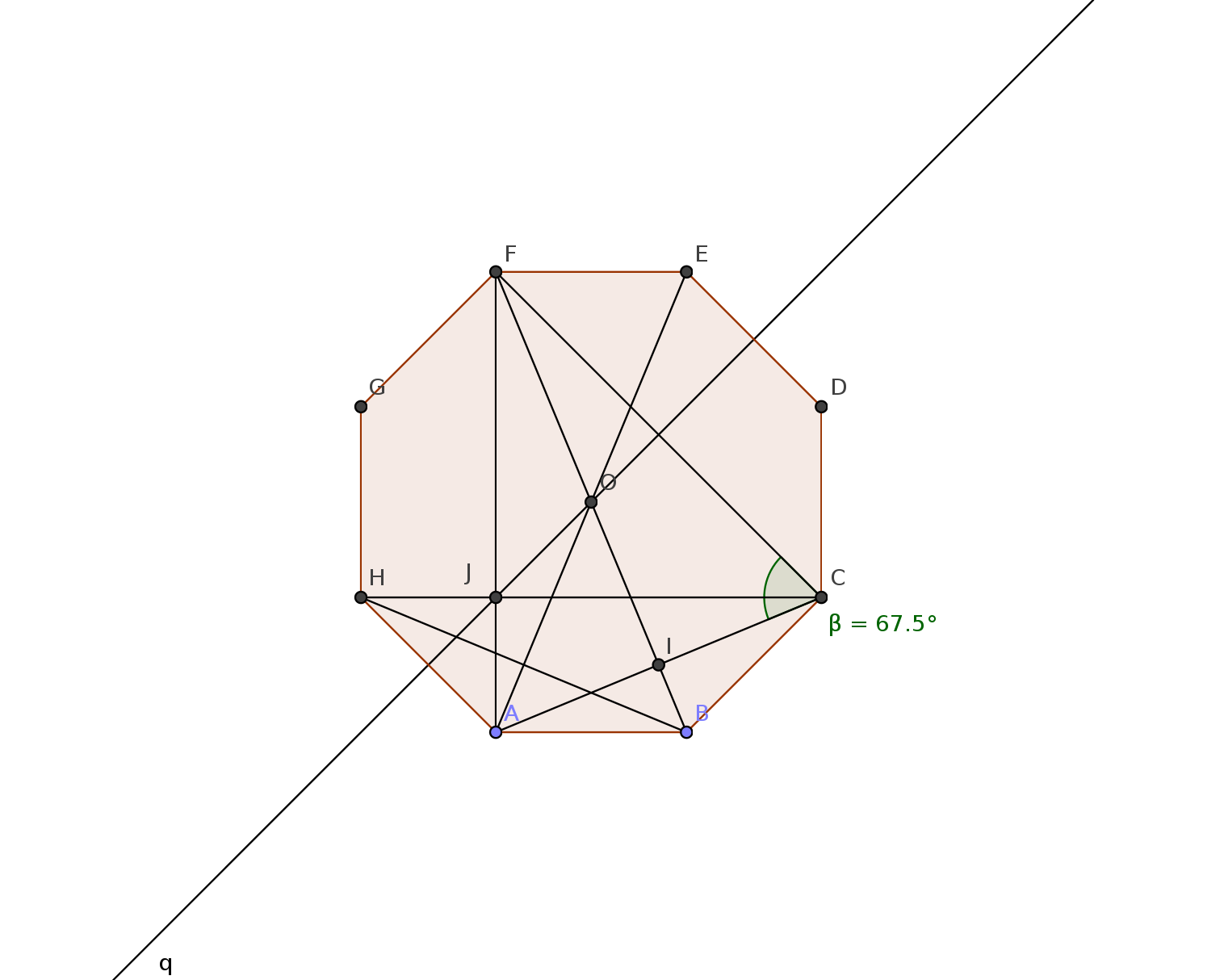 E-Bahut Boltzmann_Solver Posté(e) le 17 février 2010 E-Bahut Signaler Posté(e) le 17 février 2010 Méthode 1 : Coquille de rédaction (CA,CF). Première chose : L'angle est négatif car il est orienté dans le sens horaire. On définit O comme le centre du polygone. Ensuite. Dans le triangle OAB, on peut dire que : * angle(AOB) = 2pi/8 (Par symétrie du polygone régulier) * OAB est isocèle en O. Donc, angle(OAB) = angle(OBA) = (pi - angle(AOB))/2 = 6pi/(8*2) = 3pi/8 Ensuite, par symétrie, OF=OE=OB=OA ==> ABFE est un rectangle et donc FAB est un triangle rectangle. Or dans le rectangle FAB, pi = pi/2 + angle(AFB) + angle(FBA) = pi/2 + angle(AFB) + 3pi/8 ==> + angle(AFB) = pi/8 De plus, toujours pas symétrie, le triangle AFC est isocèle en F. Donc, par symétrie, on a I milieu de AC ===> FI médiane de AFC ===> bissectrice de AFC en F par propriété du triangle isocèle ==> Donc angle(AFC) = 2*angle(AFB) = pi/4 Donc angle(FCA) = (pi-angle(AFC))/2 = 3pi/8 Donc (CA,CF) = -3pi/8 Méthode 2) Finalement la première est meilleur. (CA,CF). Première chose : L'angle est négatif car il est orienté dans le sens horaire. On définit O comme le centre du polygone. Ensuite. Dans le triangle OAB, on peut dire que : * angle(AOB) = 2pi/8 (Par symétrie du polygone régulier) * OAB est isocèle en O. Donc, angle(OAB) = angle(OBA) = (pi - angle(AOB))/2 = 6pi/(8*2) = 3pi/8 Le polygone étant pair, toute droite passant par par O et un point du polygone est axe de symétrie de celui-ci. De même, vu que le triangle formé par O et un coté du polygone est isocèle en O, Toute médiatrice de ce triangle est axe de symétrie. Soit q, la droite définie par la médiatrice de AH. Par conséquent A et H sont symétrique par q et F et C aussi. Donc AF et CH ont la même longueur et son intersection J appartient à la droite q. Donc, on peut dire que les triangles HJA et FJC sont isocèles en J. De plus, angle(AHJ) = 3pi/4-pi/2 = pi/4. Donc les triangles HJA et FJC sont isocèles rectangles en J ===> angle(JFC) = pi/4 ===> angle(FCA) = (pi-pi/4)/2 = 3pi/8 A toi d'y réfléchir.